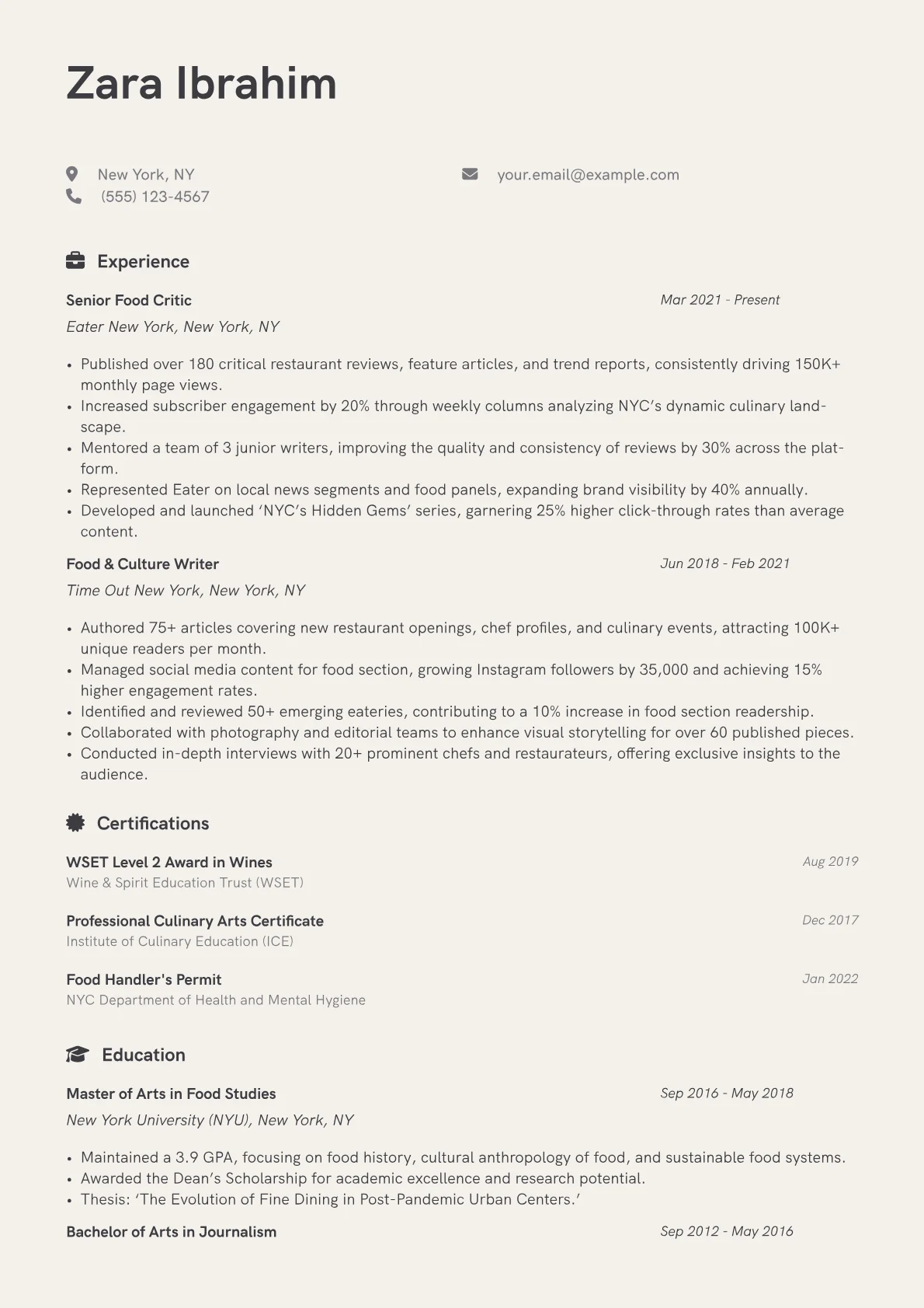 A strong Food Critic resume for Media & Entertainment professionals must tantalize hiring managers with more than just a love for food. They seek compelling narrative skills, a demonstrable critical palate, and a proven ability to engage audiences through evocative writing and multimedia content. The unique challenge lies in quantifying subjective taste experiences and showcasing a broad, analytical understanding of culinary trends and market impact.