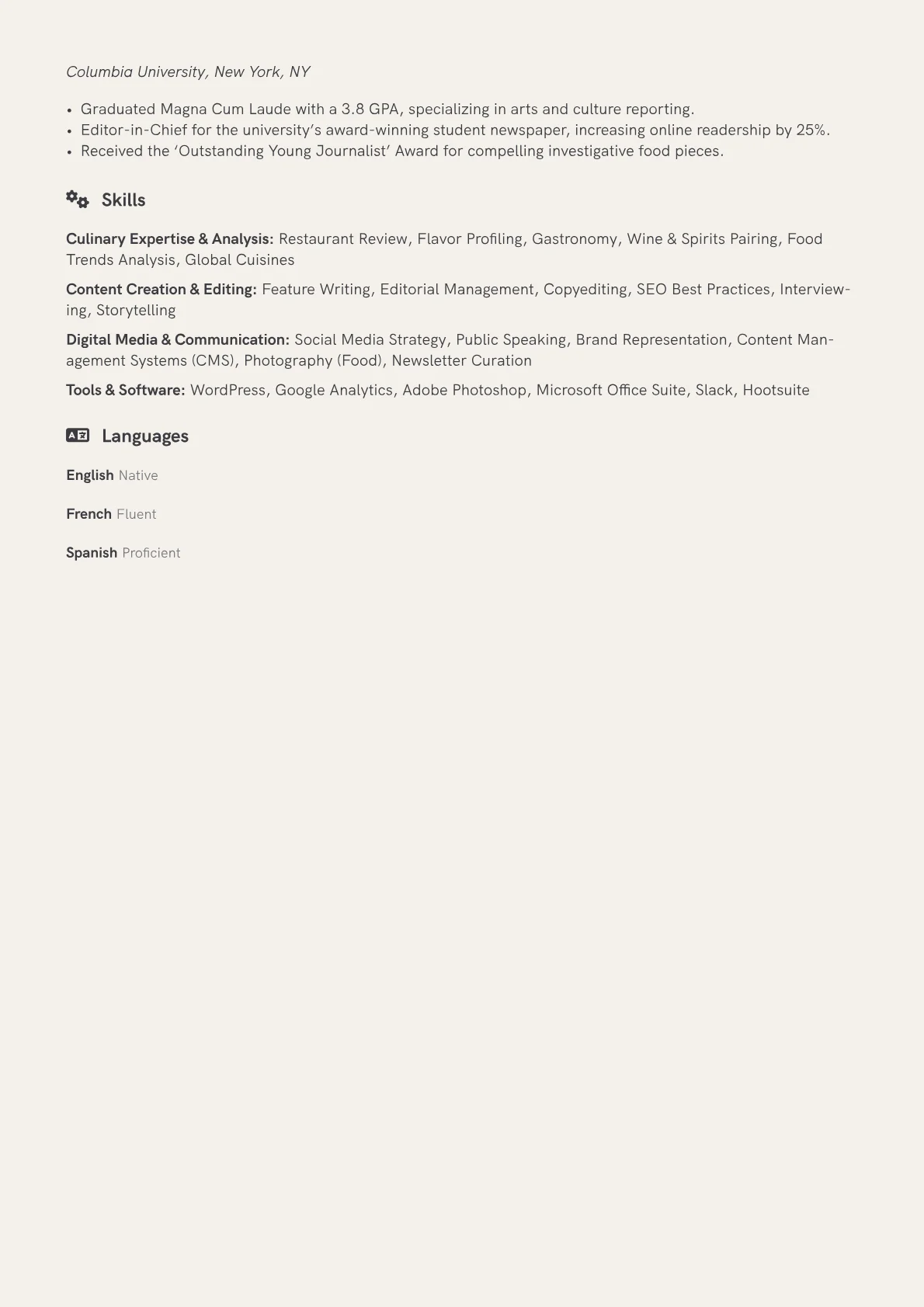 This example excels by strategically grouping skills such as culinary expertise, digital media proficiency, and critical analysis, immediately highlighting a diverse skill set crucial for modern food journalism. Quantified achievements, like specific readership growth or social media engagement statistics tied to reviews, powerfully demonstrate tangible impact and reach. The prominent placement of a portfolio link also ensures hiring managers can quickly access published works and assess writing style and scope.