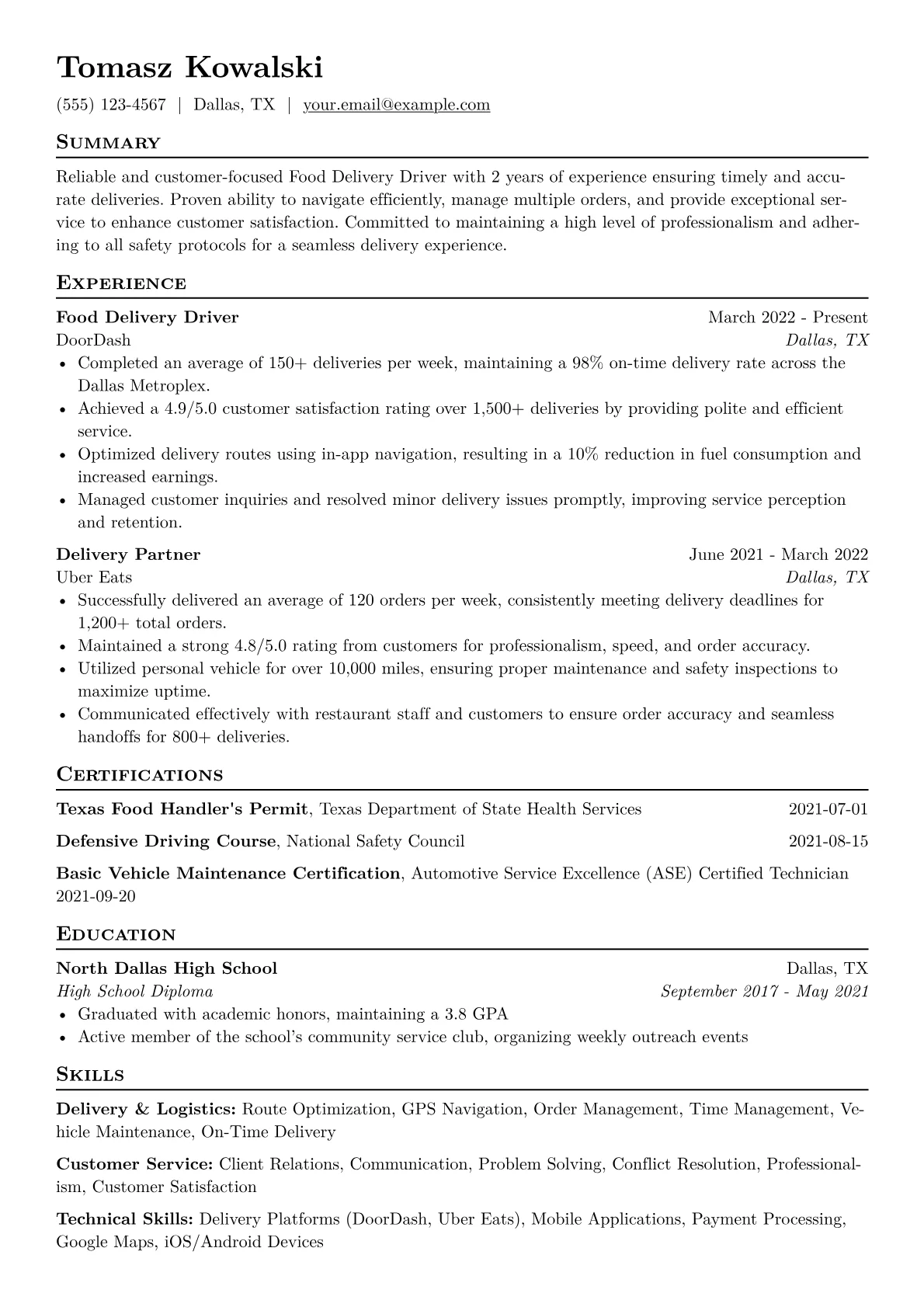 This example CV excels by concretely quantifying accomplishments. It details achievements like "maintained a 98% on-time delivery rate across 500+ deliveries" and "achieved an average customer rating of 4.9 out of 5 stars." Skills are logically grouped under categories such as "Logistics & Operations" and "Customer Service," clearly showcasing proficiency in route optimization and professional interaction. Highlighting relevant tools and certifications, such as "Proficient with DoorDash and Grubhub driver apps" and "Valid Food Handler's Permit," immediately communicates preparedness and capability specific to the role.