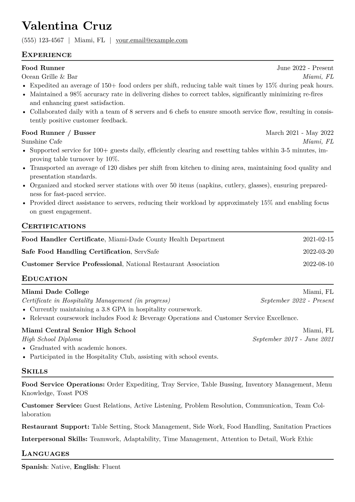 A strong Food Runner resume highlights efficiency, communication, and a calm demeanor in fast-paced environments. Hiring managers in diverse food service settings prioritize candidates who demonstrate reliability, attention to detail in order delivery, and strong teamwork. The unique challenge lies in accurately coordinating between kitchen and front of house while ensuring exceptional guest experiences.
