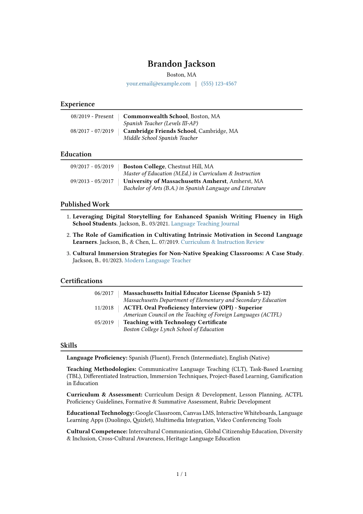 This JobSprout example excels by incorporating quantified achievements, like increases in student test scores or participation rates, alongside relevant certifications such as ACTFL or specific language proficiency credentials. Its strategic grouping of teaching methodologies, technological proficiencies, and cross-cultural communication skills provides a clear, comprehensive overview of the candidate's expertise. This structure effectively communicates a mid-level educator's impact.