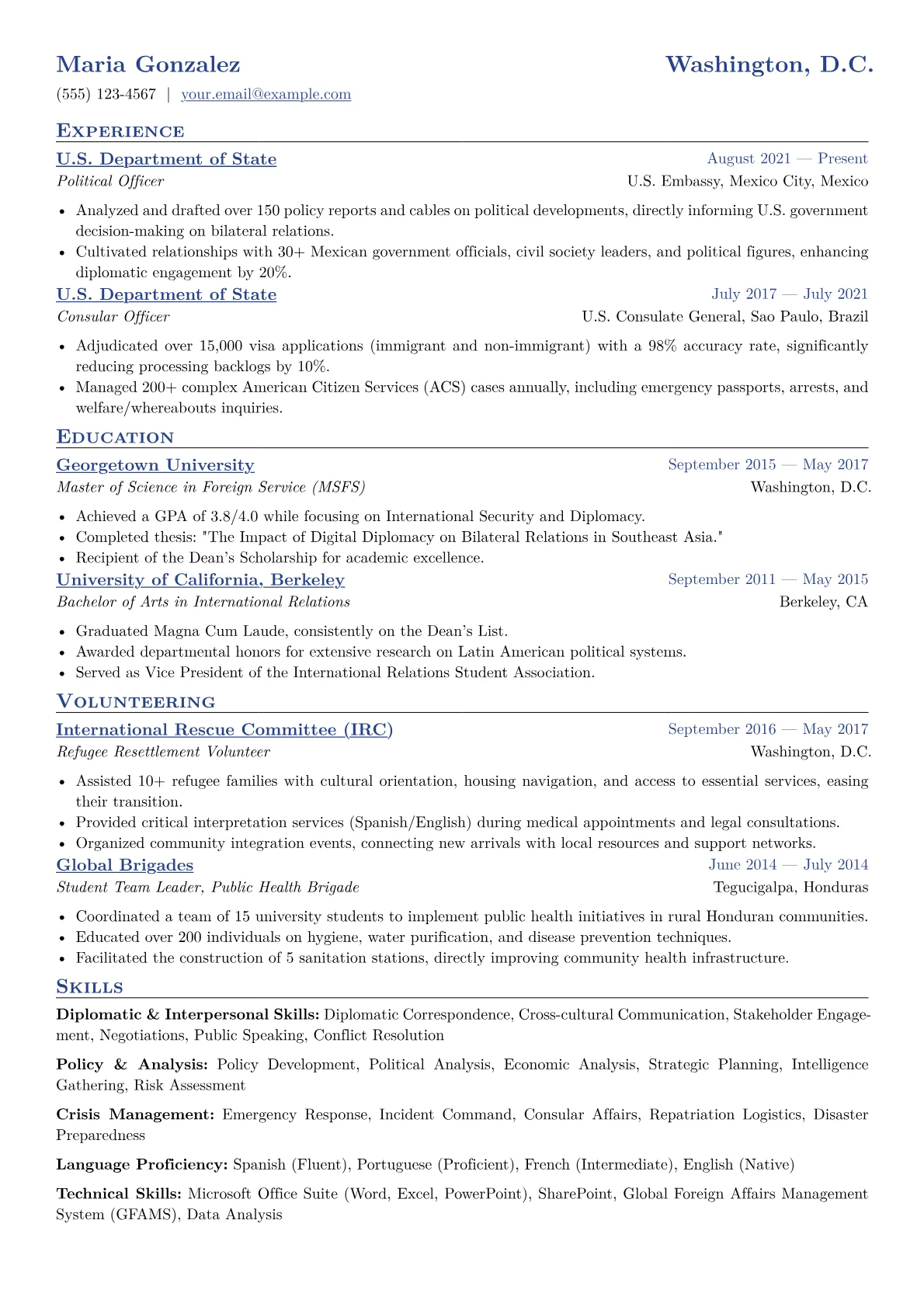 This example excels by showcasing quantified achievements directly linked to diplomatic outcomes and policy implementation. Its clear skills grouping, emphasizing foreign language proficiency, crisis management, and policy analysis, effectively presents a multifaceted professional. The chronological experience section also highlights leadership roles and international postings critical for FSO roles.