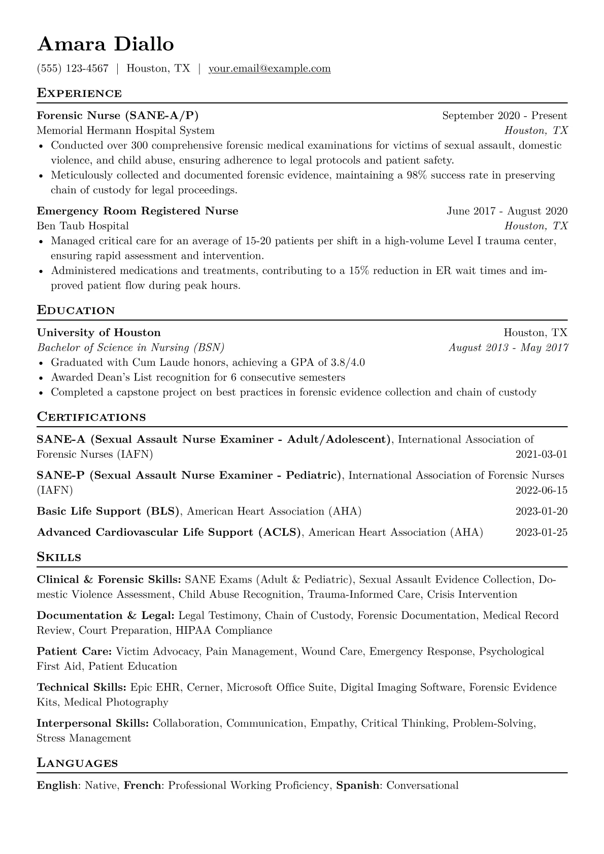 This example excels by highlighting quantified achievements, such as "managed 40+ complex cases annually" and "reduced documentation errors by 15%." It strategically groups relevant certifications like SANE-A and Trauma Nursing Core Course, underscoring specialized qualifications. Furthermore, the resume effectively organizes skills, distinguishing clinical competencies from legal advocacy and interpersonal abilities, offering a clear overview for busy recruiters.