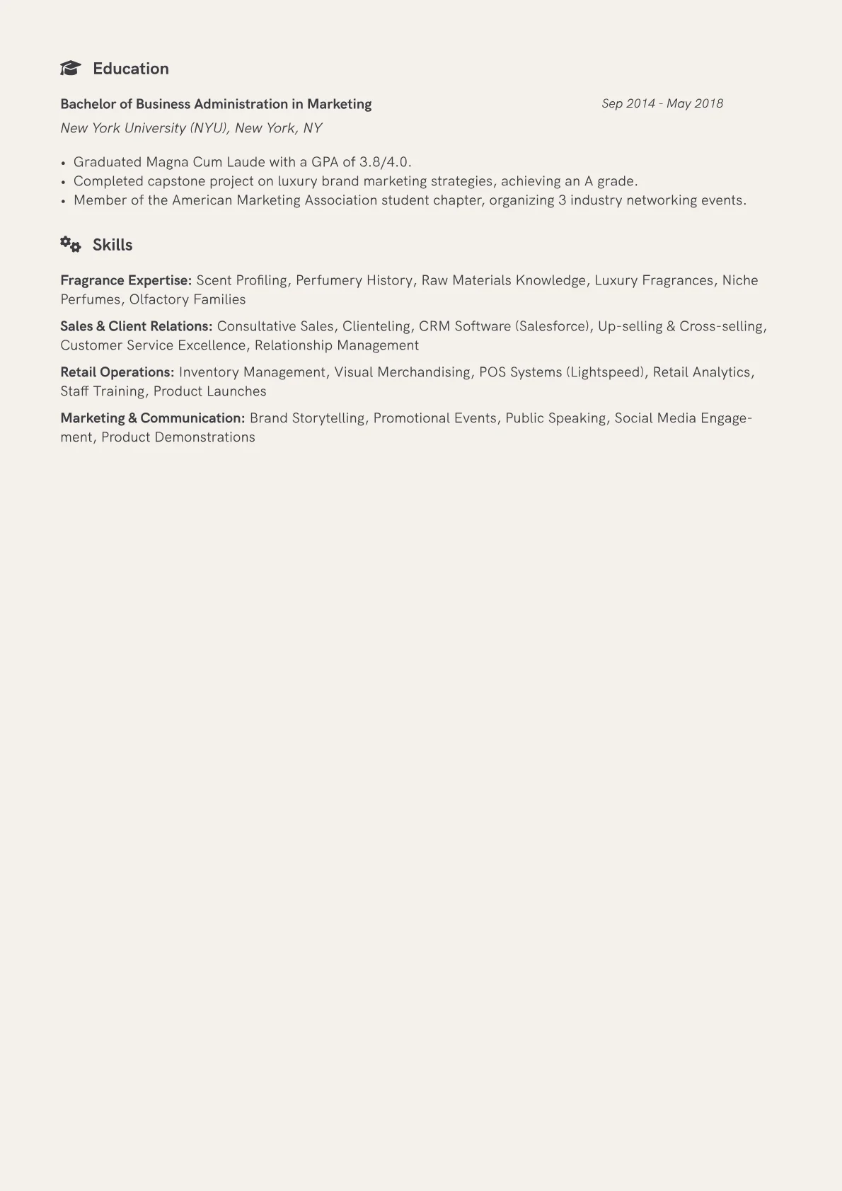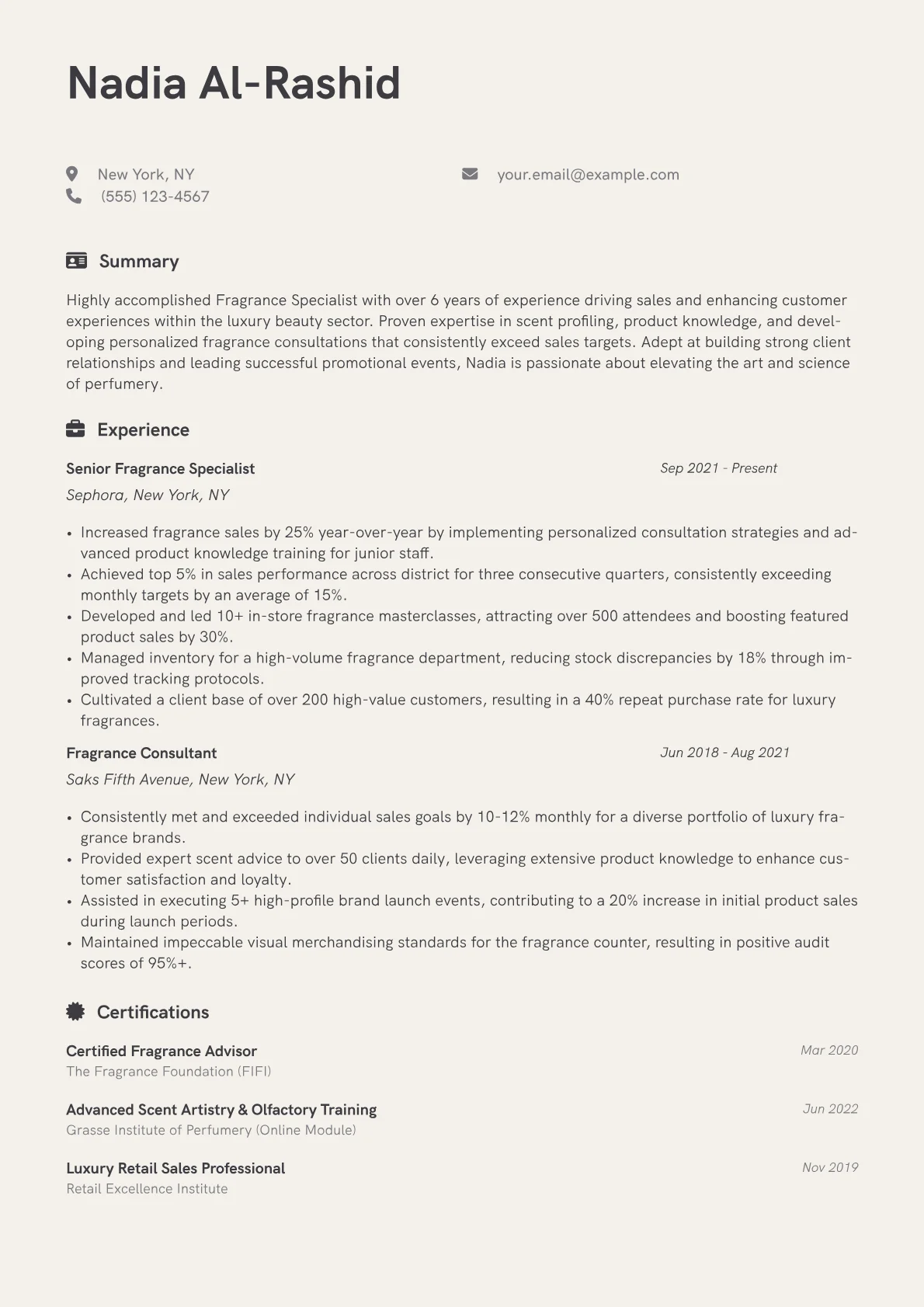 This template was built with JobSprout and can be remixed to create your own tailored Fragrance Specialist resume. Craft a document that reflects your unique expertise and career aspirations.