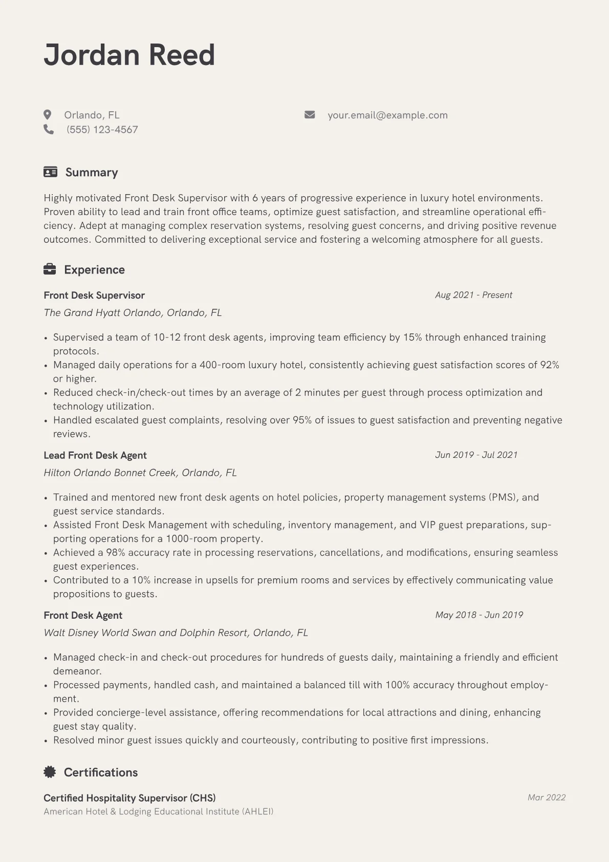 Hiring managers evaluating a Front Desk Supervisor resume in varied industry settings prioritize leadership in guest services and operational expertise. They look for candidates who expertly manage front desk teams, resolve complex guest issues, and ensure smooth daily operations. Specific achievements should highlight improved guest satisfaction metrics, streamlined check-in procedures, or successful training programs for new front desk agents. Certifications in property management systems like Opera or custom CRMs, alongside strong command of shift scheduling and inventory management, are highly valued. Understanding nuanced guest needs and maintaining security protocols are also key expectations for this mid-level role.