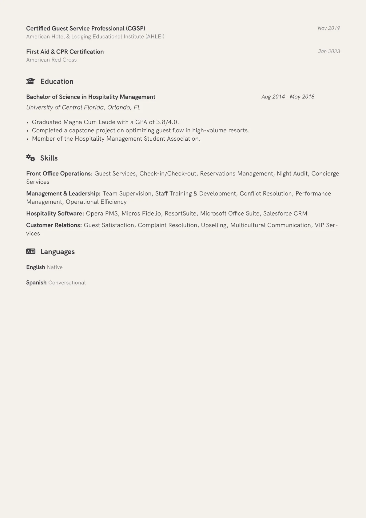 The example CV effectively demonstrates these critical competencies. Its quantified achievements, such as "Reduced average guest wait times by 12% through optimized scheduling," vividly showcase impact. Skills are clearly delineated into operational, technical (listing specific PMS or booking software), and soft skills like conflict resolution and team leadership. Certifications in relevant customer service platforms or professional development courses are prominently featured, providing immediate insight into specialized knowledge. This structure precisely highlights the blend of direct guest interaction, team oversight, and administrative proficiency essential for a Front Desk Supervisor.