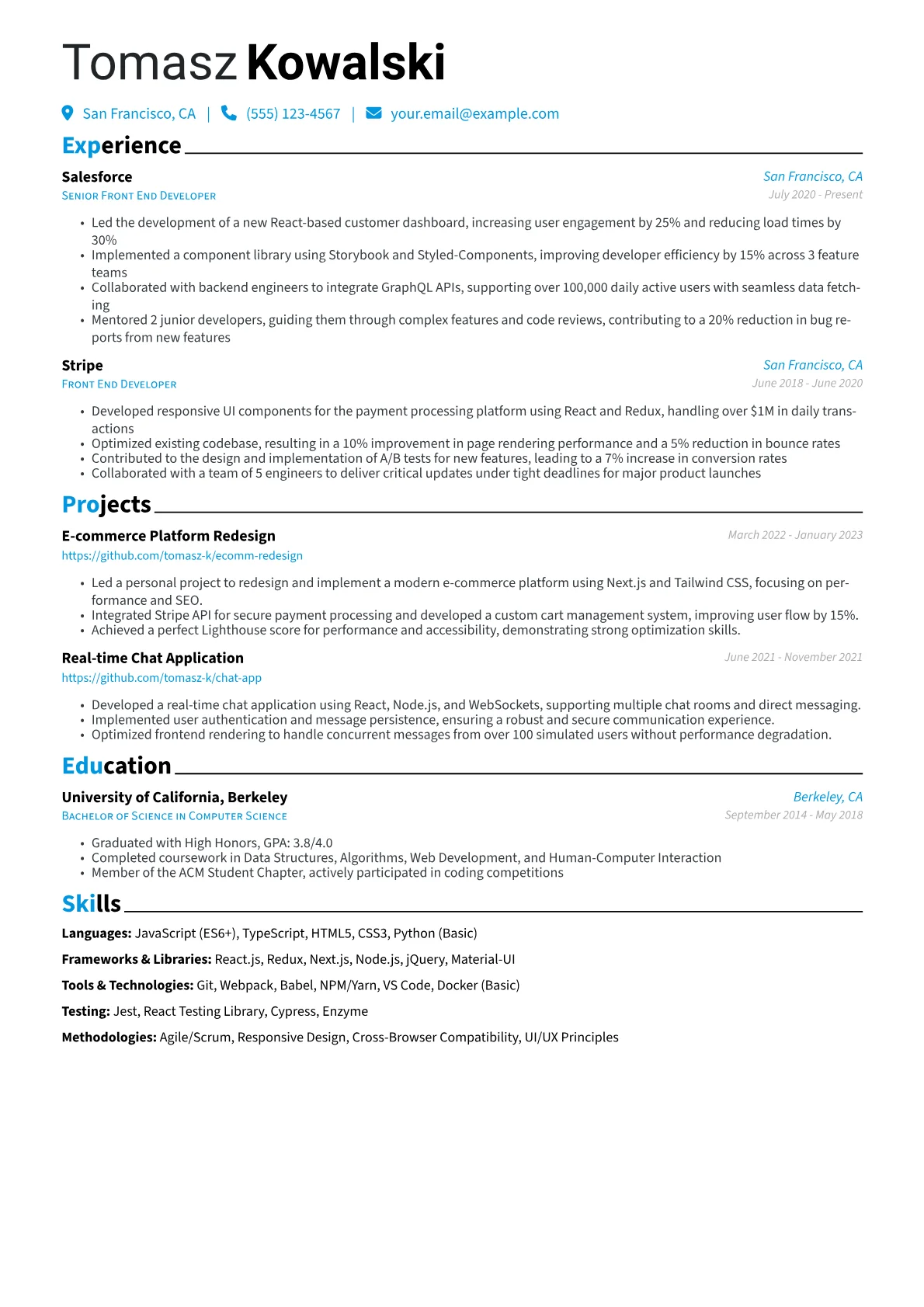 This impressive template, designed with JobSprout, offers a solid foundation for any mid-level Front End Developer looking to create their own impactful resume.