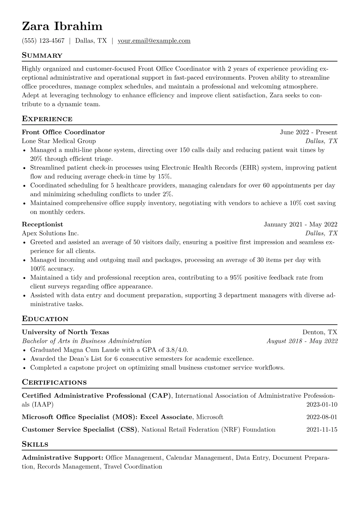 This template was built with JobSprout and can be remixed to create your own tailored Front Office Coordinator resume.