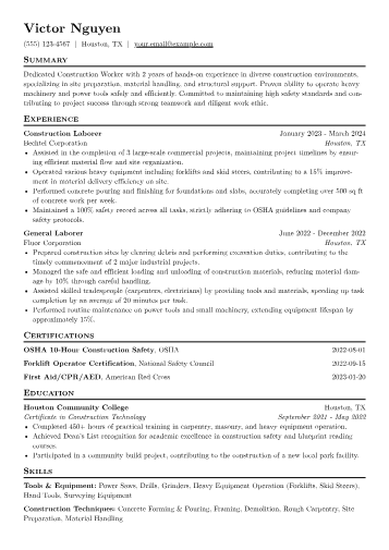 This example CV excels by structuring these critical details clearly. Achievements are quantified, such as "Reduced material waste by 15% through optimized cutting patterns," demonstrating tangible impact. Skills are grouped logically under headings like "Precision Joinery," "Machine Operation," and "Finishing Techniques," making specific expertise immediately apparent. Furthermore, specific certifications like "Advanced Woodworking Certificate" and familiarity with CAD/CAM software for furniture design are prominently highlighted, showcasing a modern, skilled craftsman.
