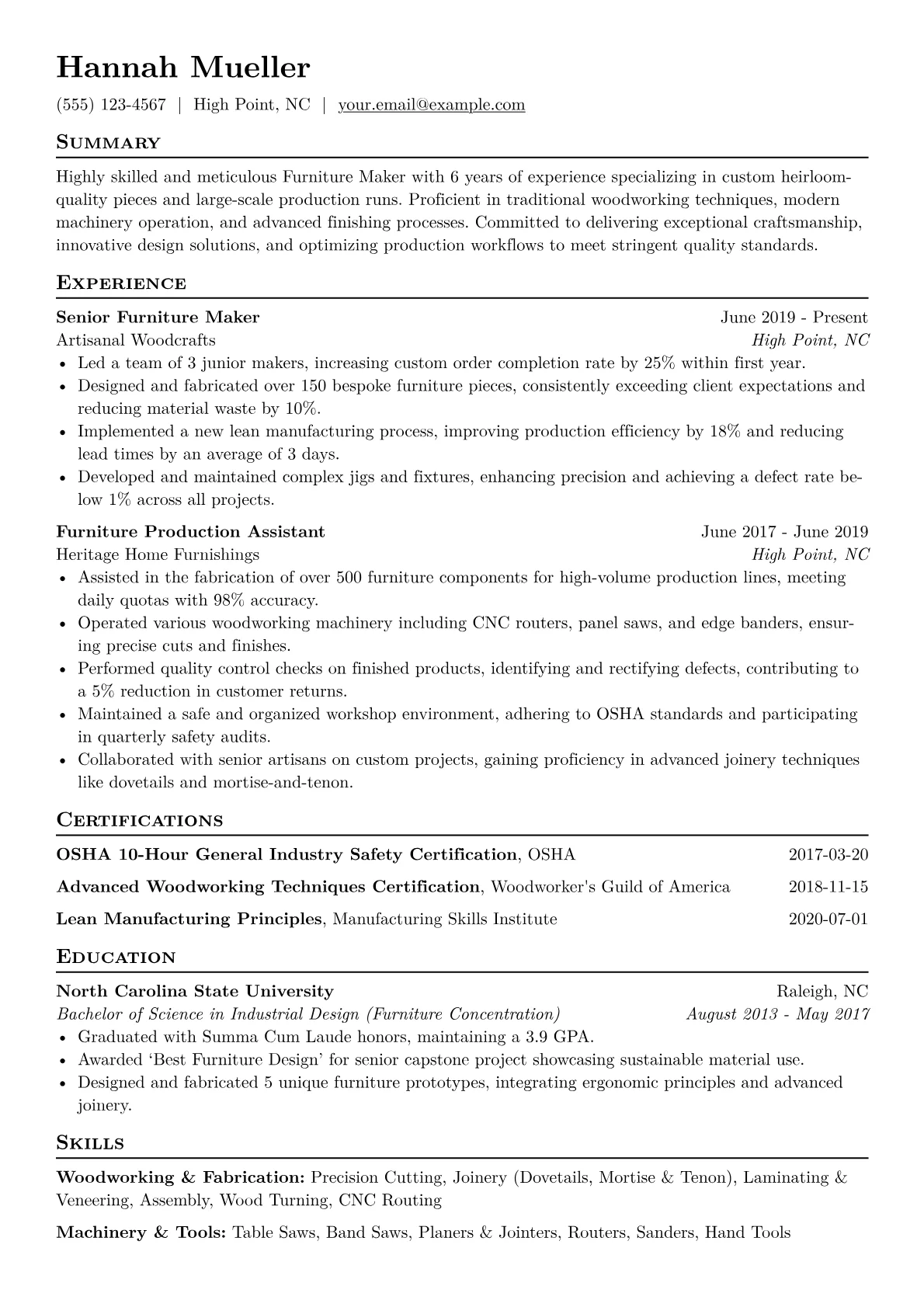 A strong Furniture Maker resume in Manufacturing emphasizes precision, material mastery, and project execution. Hiring managers seek candidates who detail experience with diverse wood species, advanced joinery techniques like dovetails or mortise and tenon, and proficiency in operating specialized machinery such as CNC routers, planers, and wide belt sanders. Quantifiable achievements in defect reduction, project completion within deadlines, and adherence to safety protocols are crucial, alongside any certifications in woodworking technology or lean manufacturing principles relevant to efficient workshop operations.