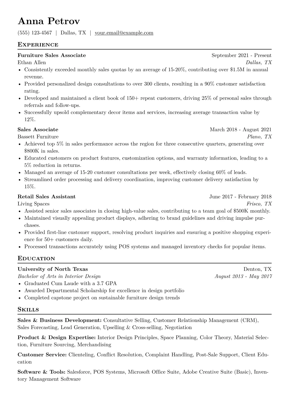 This resume example excels by featuring prominent, quantified achievements, such as percentage increases in sales or customer satisfaction scores, right at the top. It effectively groups relevant sales, customer service, and product knowledge skills, demonstrating both practical ability and industry understanding crucial for furniture sales. The clear presentation helps hiring managers quickly identify a candidate who meets the specific demands of high-value retail.
