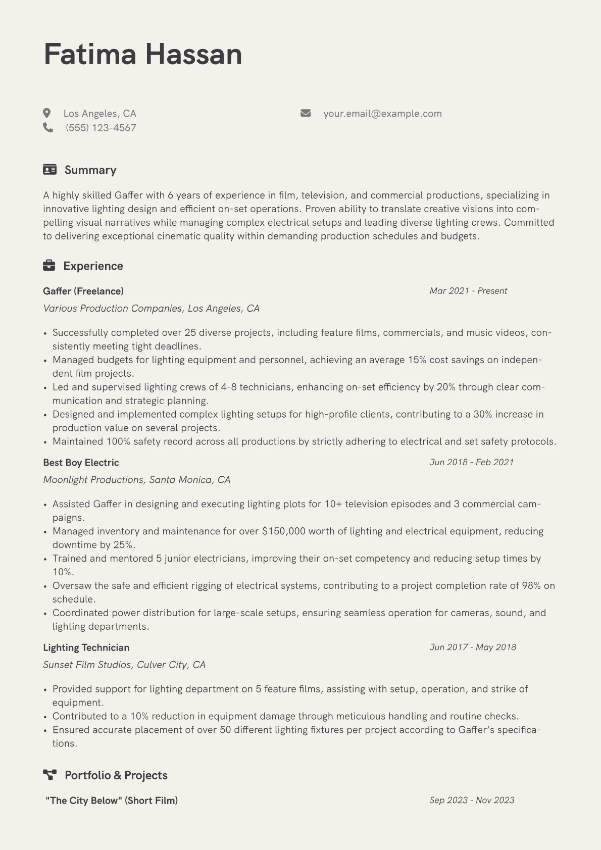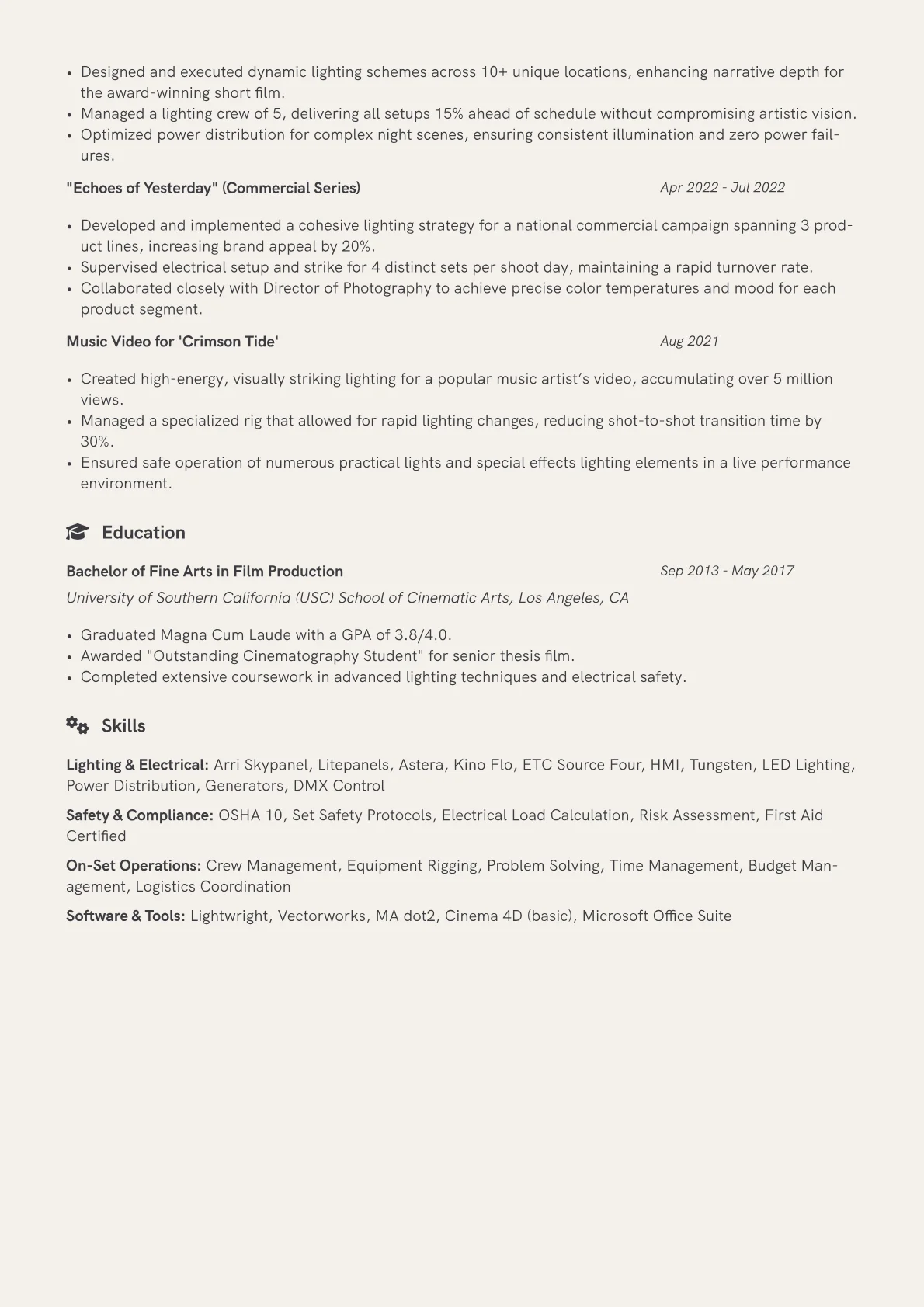 Crafting a strong Gaffer resume in Media & Entertainment requires highlighting specific technical expertise and on-set experience. Hiring managers prioritize candidates who demonstrate mastery of various lighting equipment, robust power distribution knowledge, and strict adherence to safety protocols. A standout resume will detail contributions to diverse productions, from feature films to commercials, mentioning specific lighting setups like LED walls or complex rigging. Certifications such as OSHA 10/30 or ETCP for entertainment technicians are crucial, as is familiarity with industry-standard control systems and fixtures.