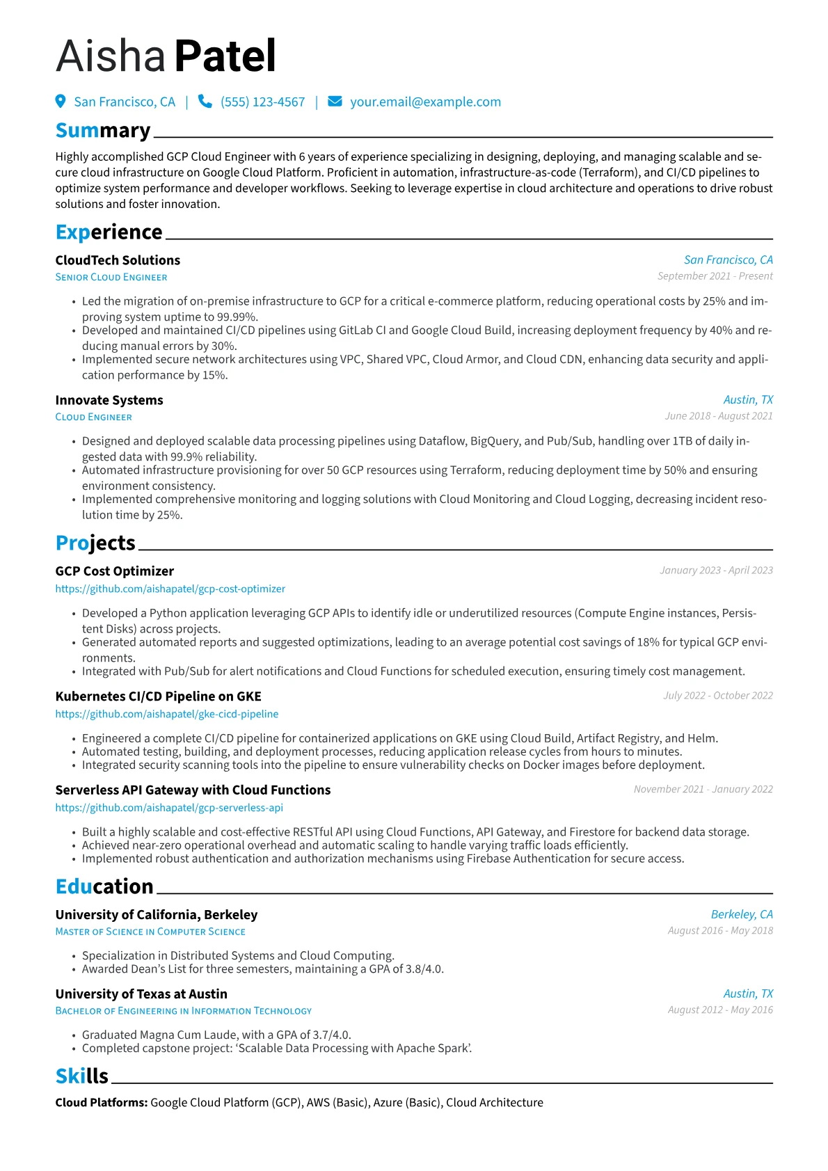 The JobSprout example effectively showcases these critical elements. Its achievement statements quantify impact, for instance, "reduced operational costs by 20% through serverless refactoring using Cloud Functions" or "deployed high-availability applications with 99.9% uptime on GKE." Skills are logically grouped by category, separating core GCP services (Compute Engine, BigQuery, Pub/Sub) from related technologies (Python, Docker, Kubernetes, Terraform). Crucially, Google Cloud certifications are prominently displayed, often near the top, signaling immediate qualification. Tools and technologies are listed within relevant experience points, illustrating practical application.