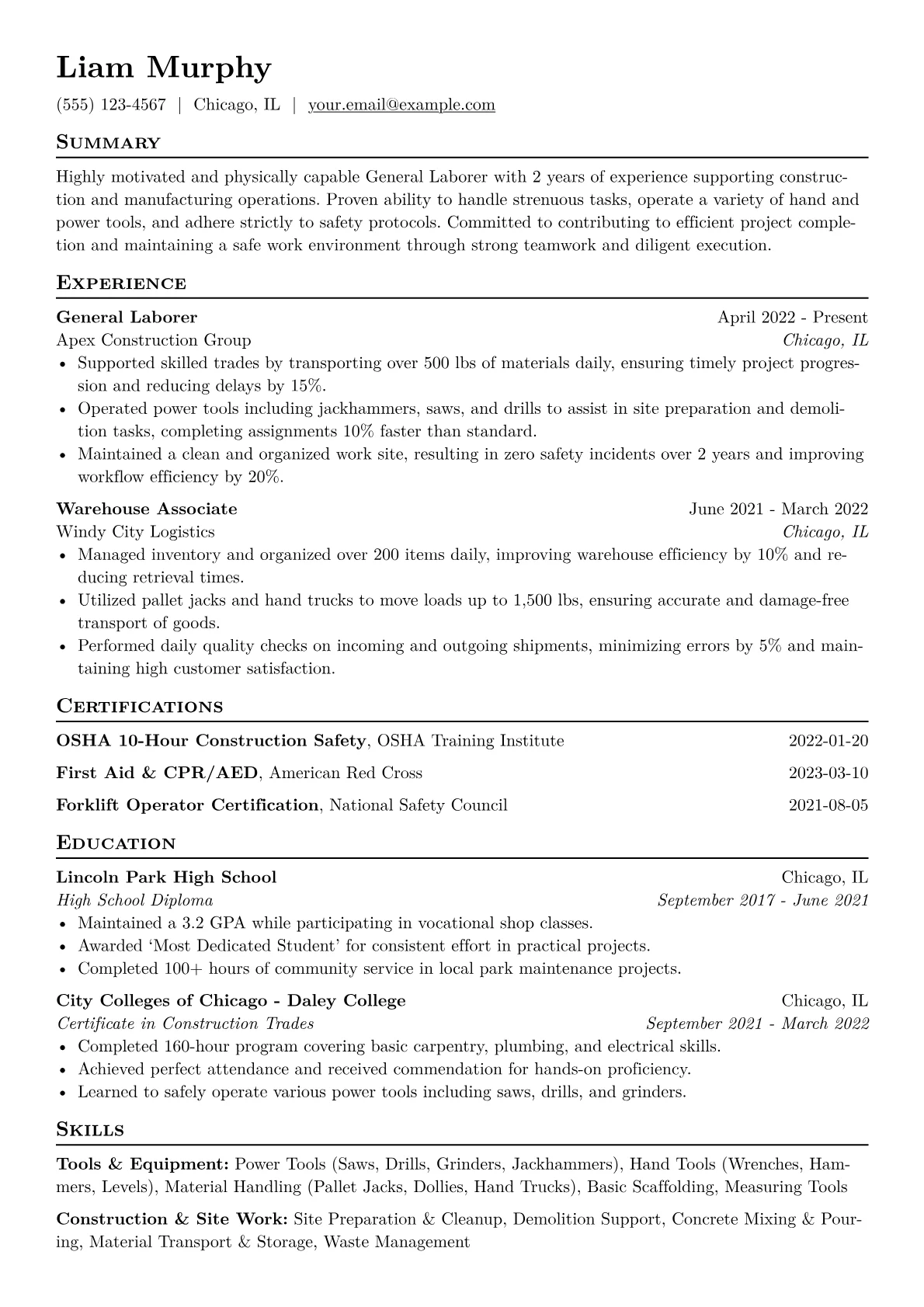 This example resume excels by clearly highlighting these critical aspects. Achievements are quantified, detailing contributions like "assisted in loading 20+ pallets per shift" or "maintained zero safety incidents across 500 working hours." Skills are logically grouped, distinguishing between "Equipment Operation" (e.g., pallet jack, hand truck) and "Safety & Compliance." Certifications are prominently displayed, assuring recruiters of foundational industry readiness, while essential tools are listed within relevant experience sections for immediate recognition.