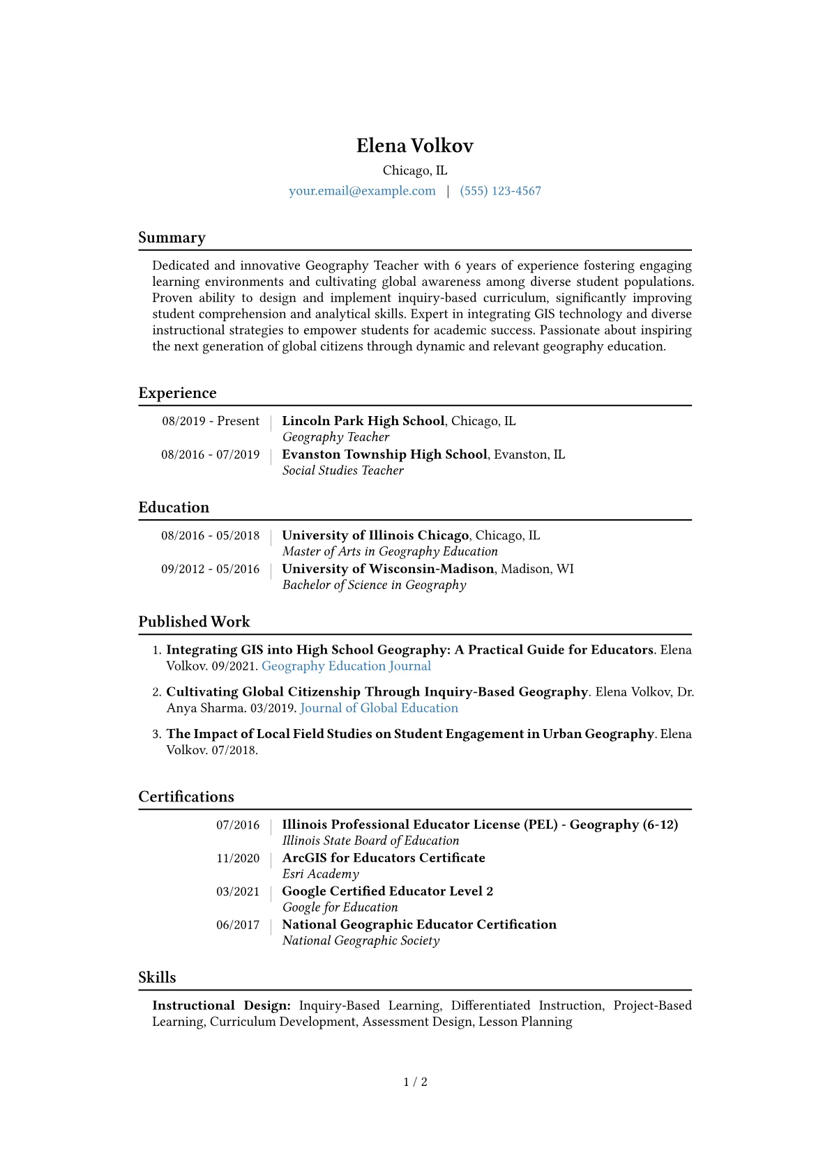 This template was built with JobSprout and can be remixed to create your own tailored Geography Teacher resume. Craft a professional document that truly reflects your unique teaching philosophy and accomplishments.