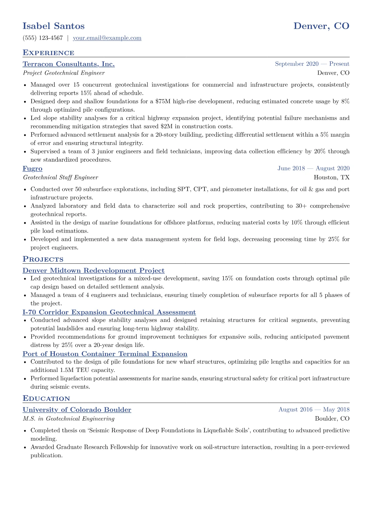 This JobSprout example excels by featuring quantified achievements that illustrate project impact and responsibility, such as managing specific investigation phases or contributing to successful designs. Its clear skills grouping separates technical software proficiency from field methodologies and report writing, offering a quick overview of capabilities. Furthermore, relevant certifications are prominently displayed, assuring recruiters of the candidate's professional standing and foundational knowledge.