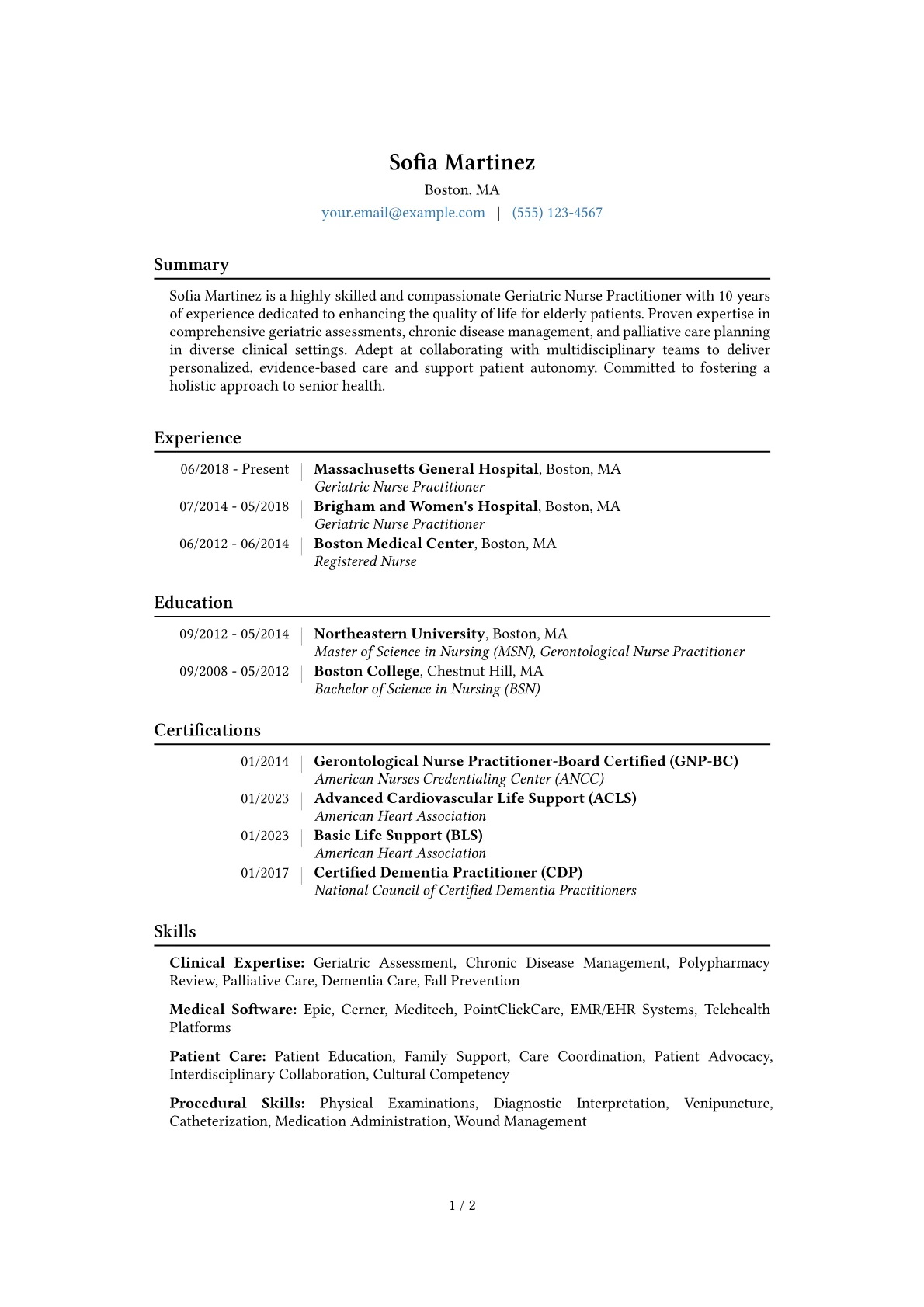 This template was built with JobSprout and can be remixed to create your own tailored Geriatric Nurse Practitioner resume.
