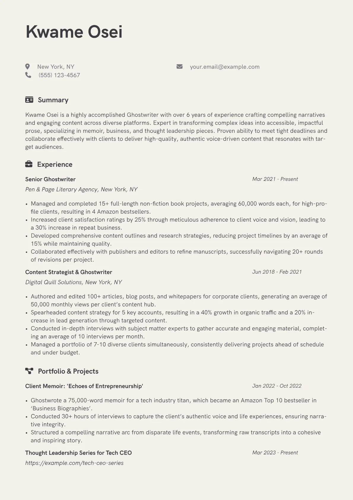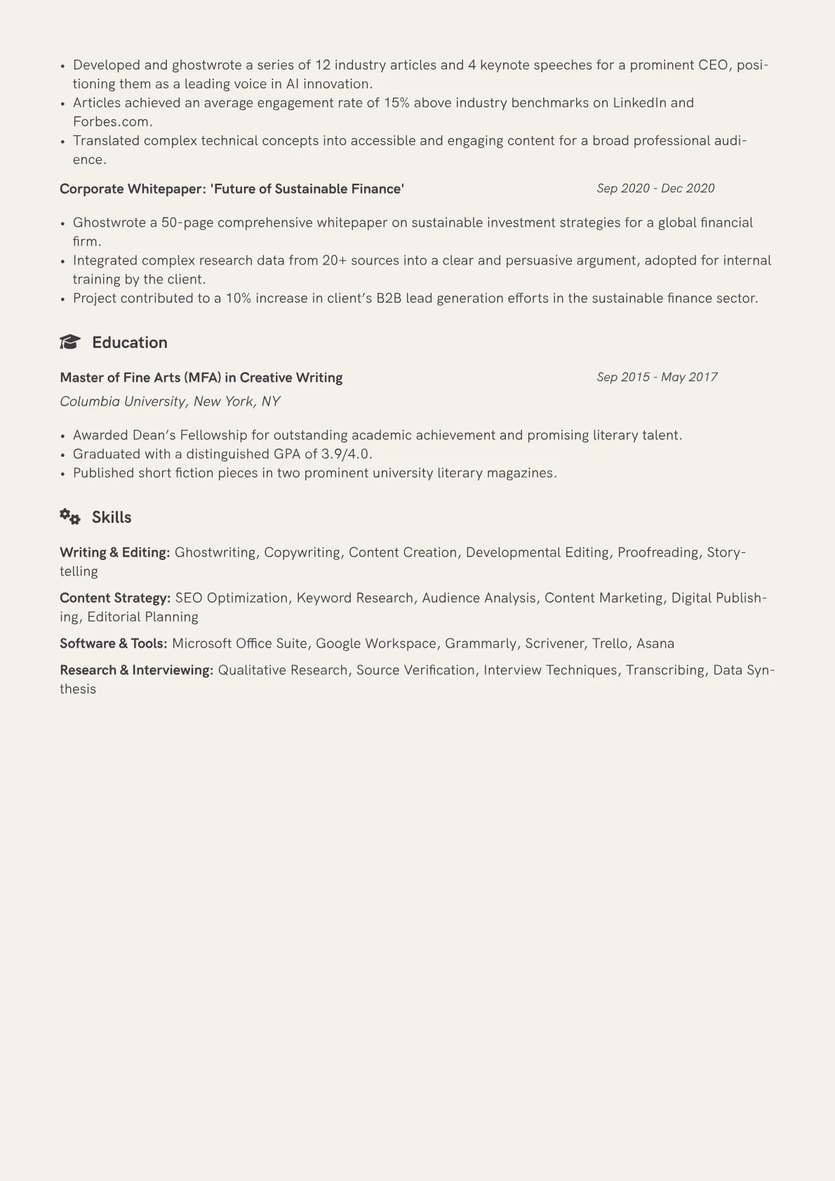 The featured Ghostwriter resume example effectively navigates these unique challenges. It quantifies achievements by focusing on outcomes, such as "improved user onboarding by 15% through enhanced microcopy development." Skills are thoughtfully grouped into categories like "Content Strategy," "Design Storytelling," and "UX Writing Tools," clearly indicating proficiency in platforms like Figma and Notion for documentation. Crucially, the resume frames contributions using action verbs that denote strategic input and support, rather than direct lead authorship, thereby articulating impact without misrepresenting roles. Certifications in UX Writing or Content Design are prominently highlighted, underscoring specialized expertise.