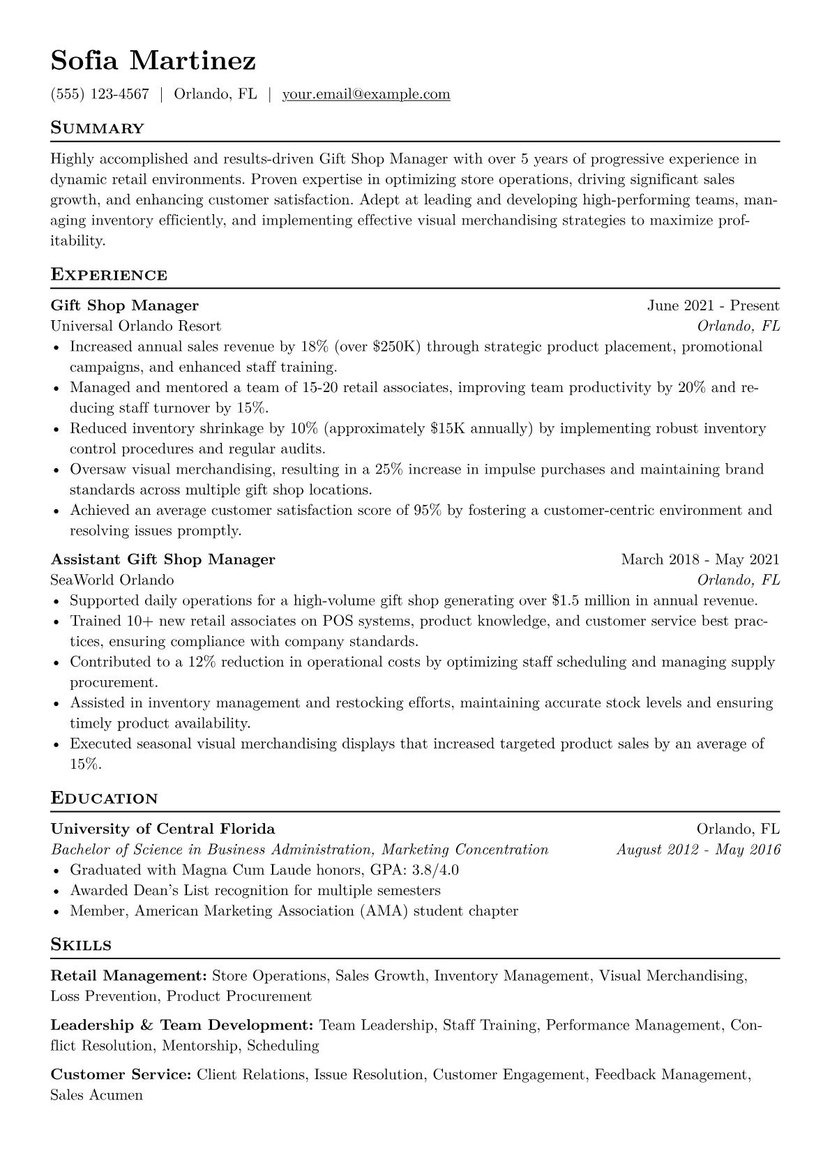 This template was built using JobSprout's intuitive builder and can be remixed to create your own tailored Gift Shop Manager resume. It provides a robust framework for presenting your unique qualifications.