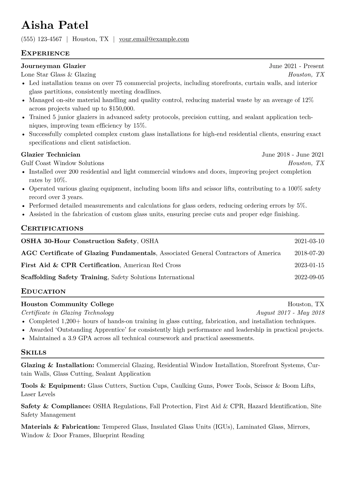 This example excels by showcasing quantified achievements, like contributions to project completion rates and waste reduction. It effectively groups technical skills, from glass cutting and tempering to frame assembly, making capabilities immediately clear. The resume also features relevant certifications, such as OSHA training, reinforcing a commitment to workplace safety and industry best practices.
