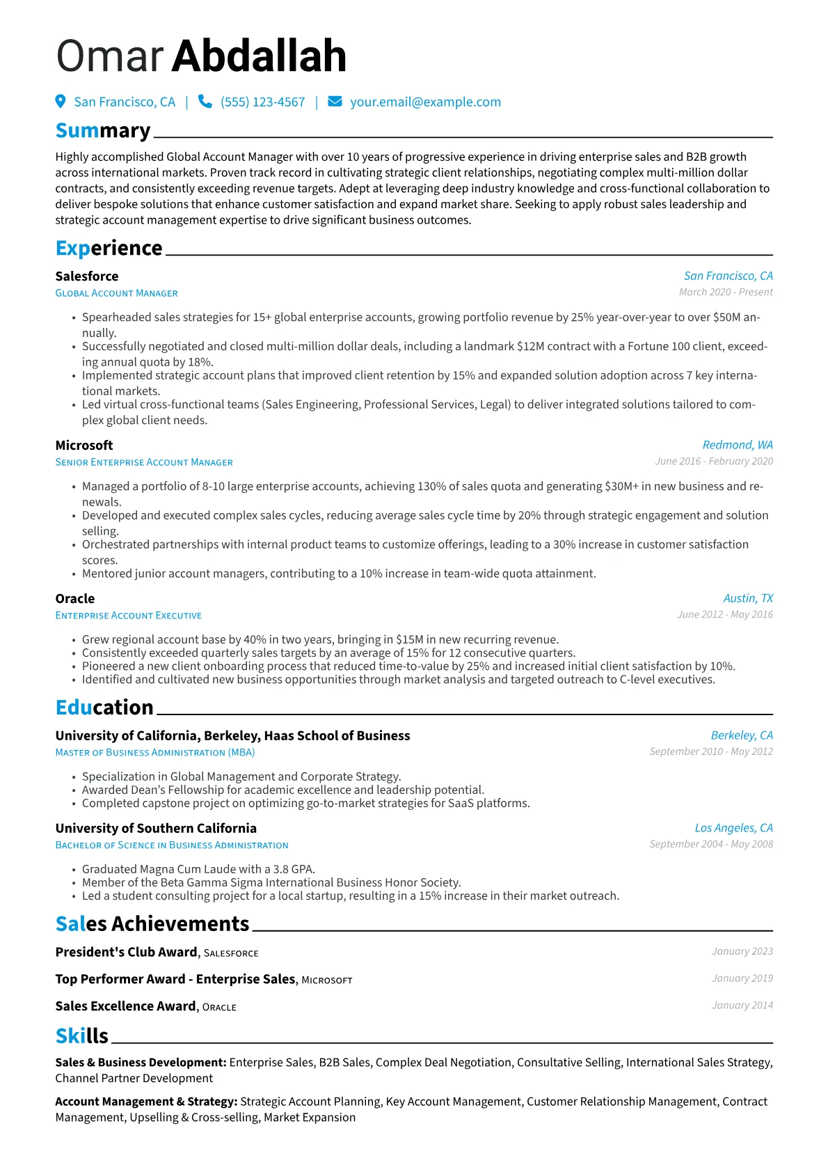 This template was built using JobSprout's intuitive builder. Prospective candidates can easily remix this example to create their own tailored Global Account Manager resume.