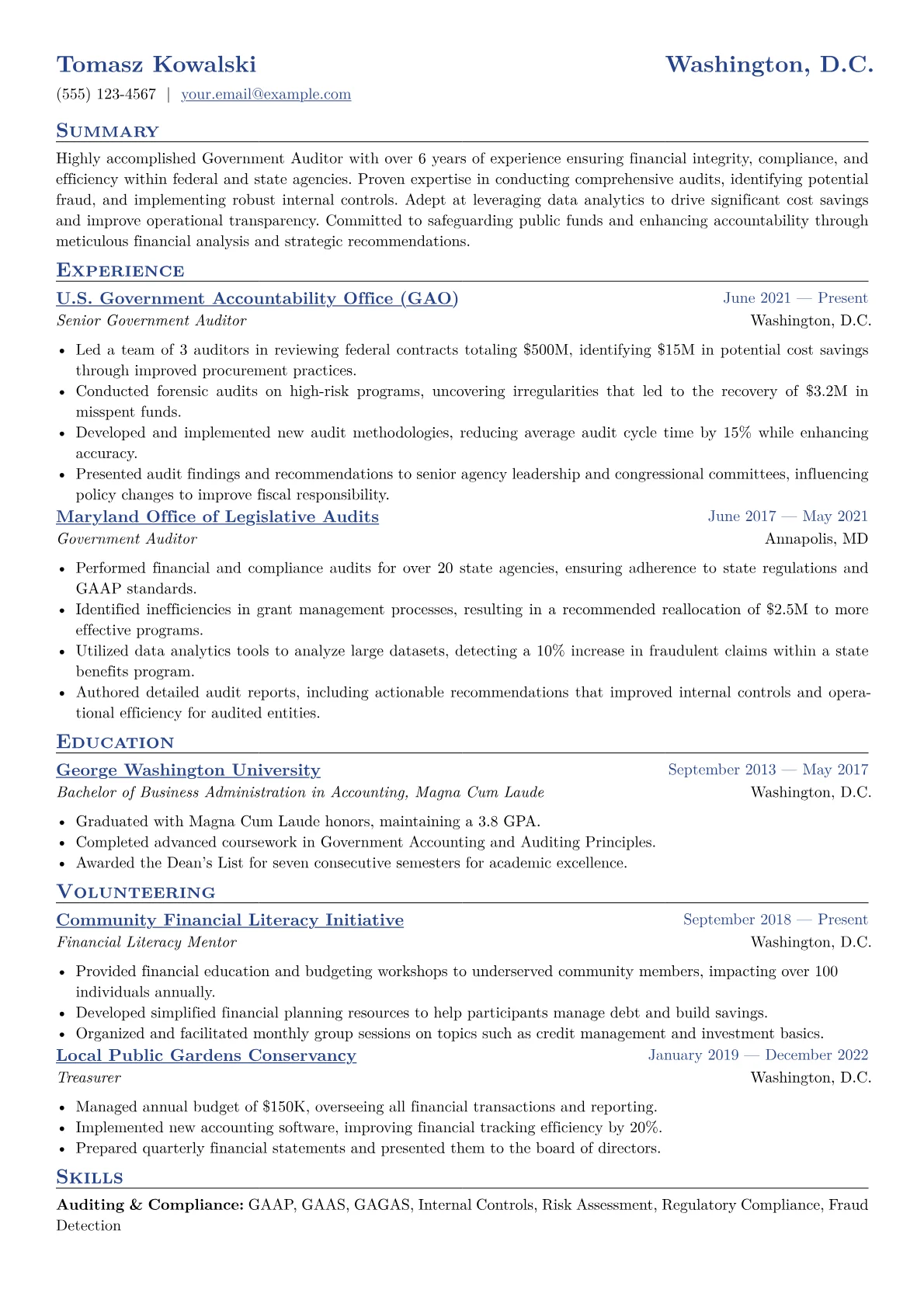 This example CV excels by structuring content to highlight these very specifics. It effectively quantifies achievements, such as "identified over $500K in non-compliant spending across three agencies" or "reduced audit report turnaround time by 15% through process optimization," directly linking actions to tangible government outcomes. Skills are intelligently grouped into categories like "Audit Methodologies (GAGAS, A-123)," "Data Analysis (ACL, IDEA)," and "Regulatory Compliance," which immediately conveys specialized capabilities. Furthermore, certifications like the CGFM are prominently featured, assuring reviewers of the candidate's commitment to public financial management.