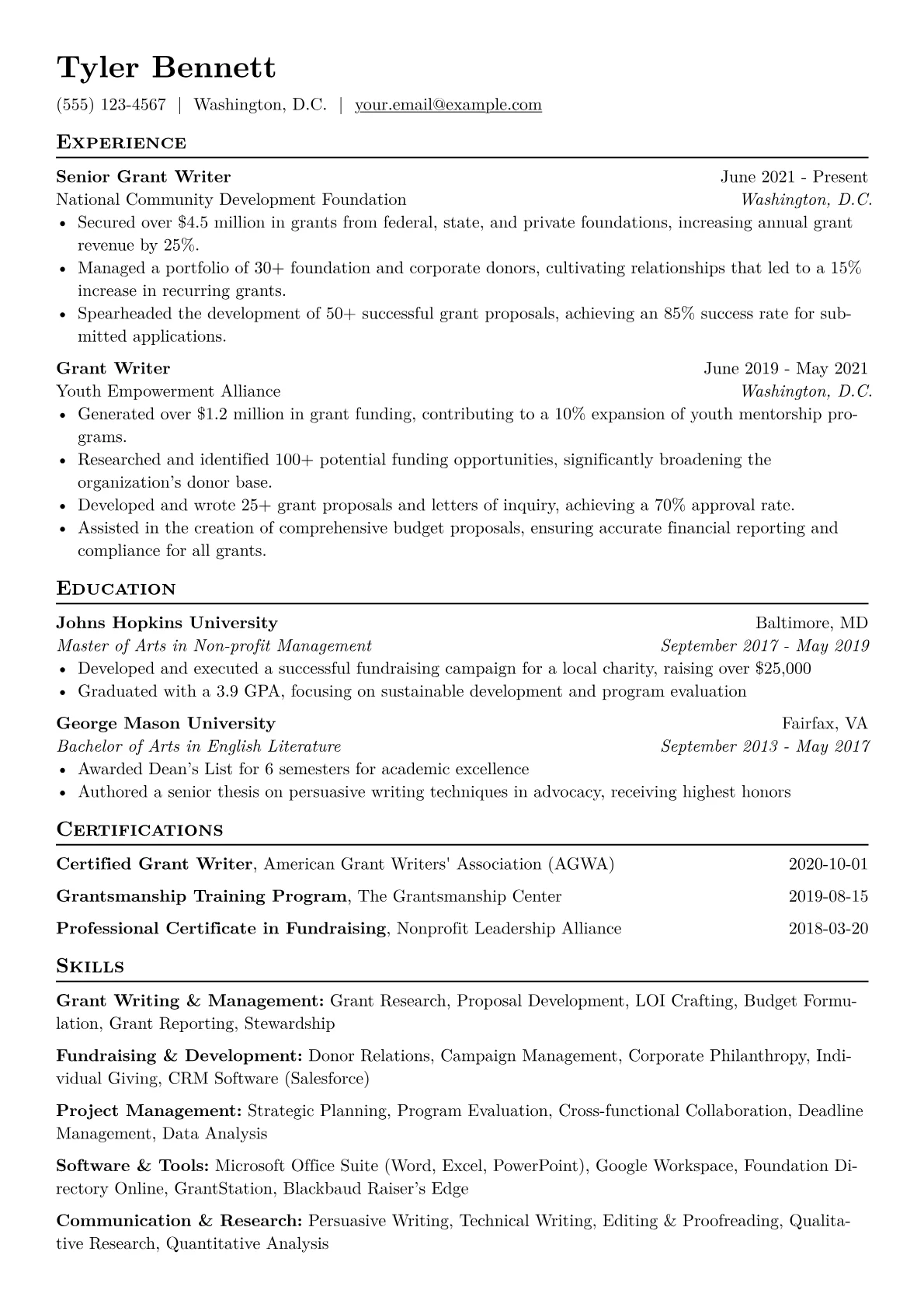 This impressive template was expertly built using JobSprout and can be easily remixed to craft your own compelling Grant Writer resume.