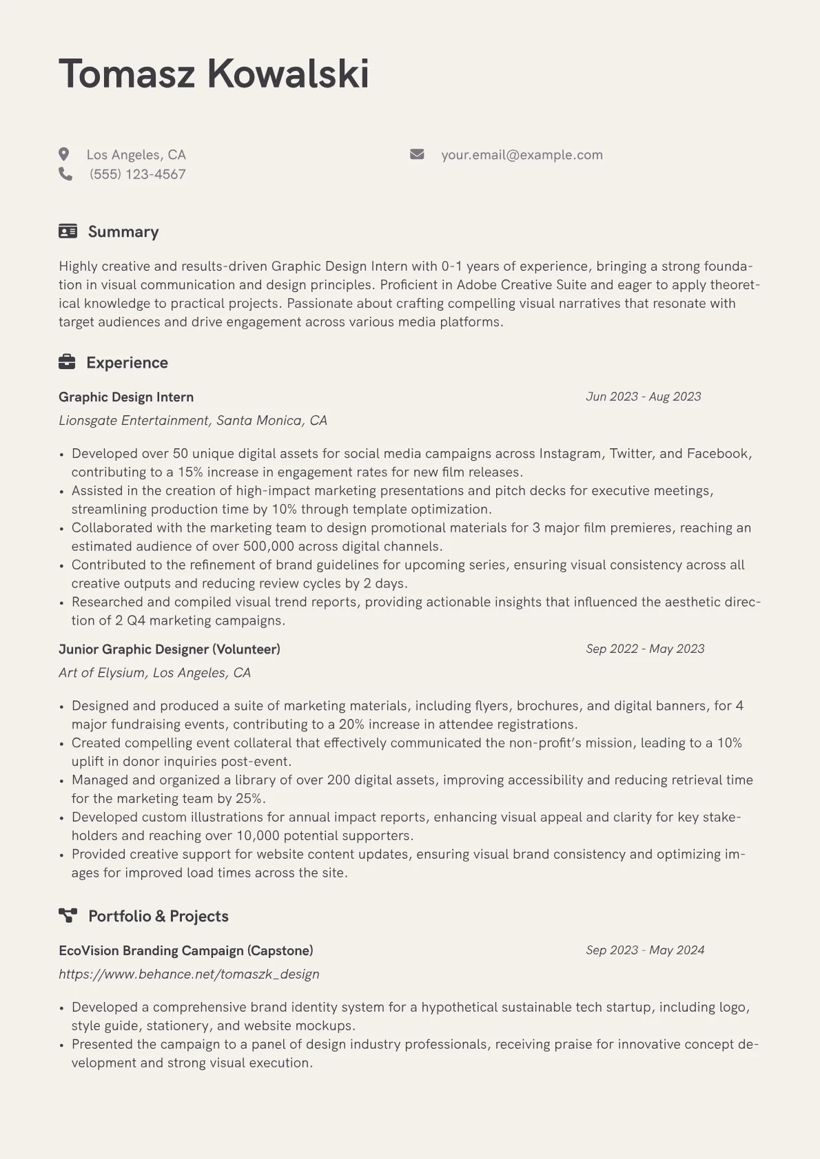 This template was built with JobSprout and can be remixed to create your own tailored Graphic Design Intern resume.