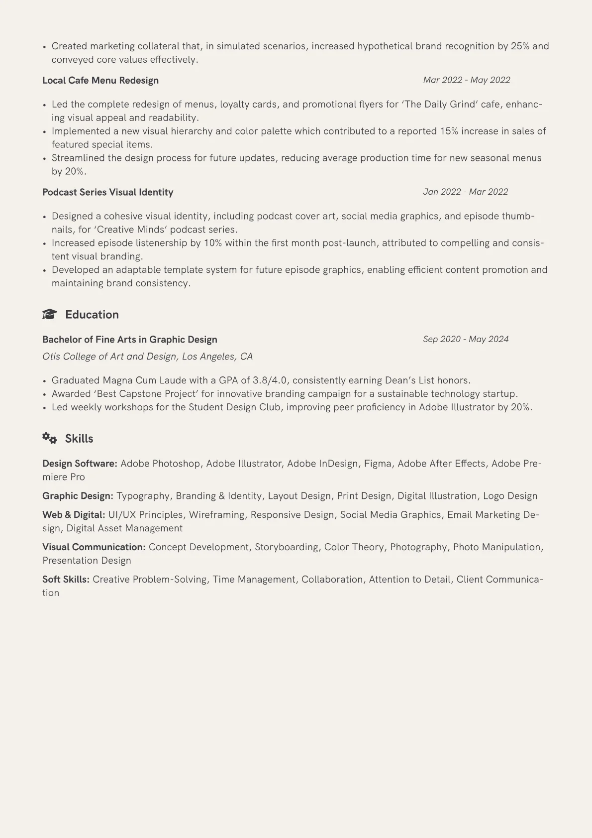 For a Graphic Design Intern in Media & Entertainment, especially one focusing on UX/UI, a resume must immediately convey practical application and potential. Hiring managers specifically look for a prominent portfolio link, demonstrating foundational design principles and process, not just aesthetic output. Showcasing academic or personal projects involving user research, wireframing, prototyping with tools like Figma or Adobe XD, and an understanding of visual hierarchy for responsive design is crucial. Concrete terminology like information architecture, interaction design, and usability testing matters, even for entry level.