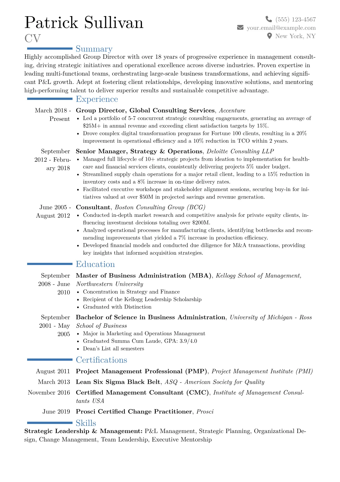 A strong Group Director resume in Consulting emphasizes transformational leadership and quantifiable P&L impact. Hiring managers specifically look for demonstrated success in leading complex client engagements, driving operational efficiencies, and cultivating new revenue streams. Concrete achievements should detail enhancements in areas like supply chain optimization or digital transformation, often referencing methodologies such as Lean Six Sigma or Agile principles and showcasing deep industry domain knowledge.