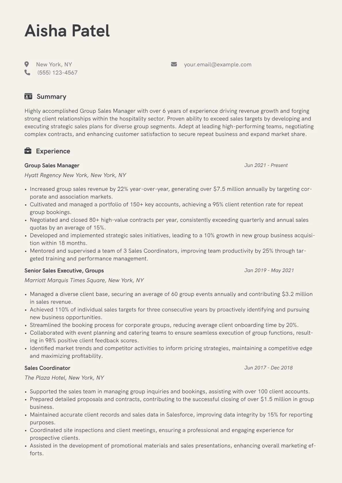 This template was built with JobSprout and can be remixed to create your own tailored Group Sales Manager resume. Leverage its structure to highlight your unique sales successes.