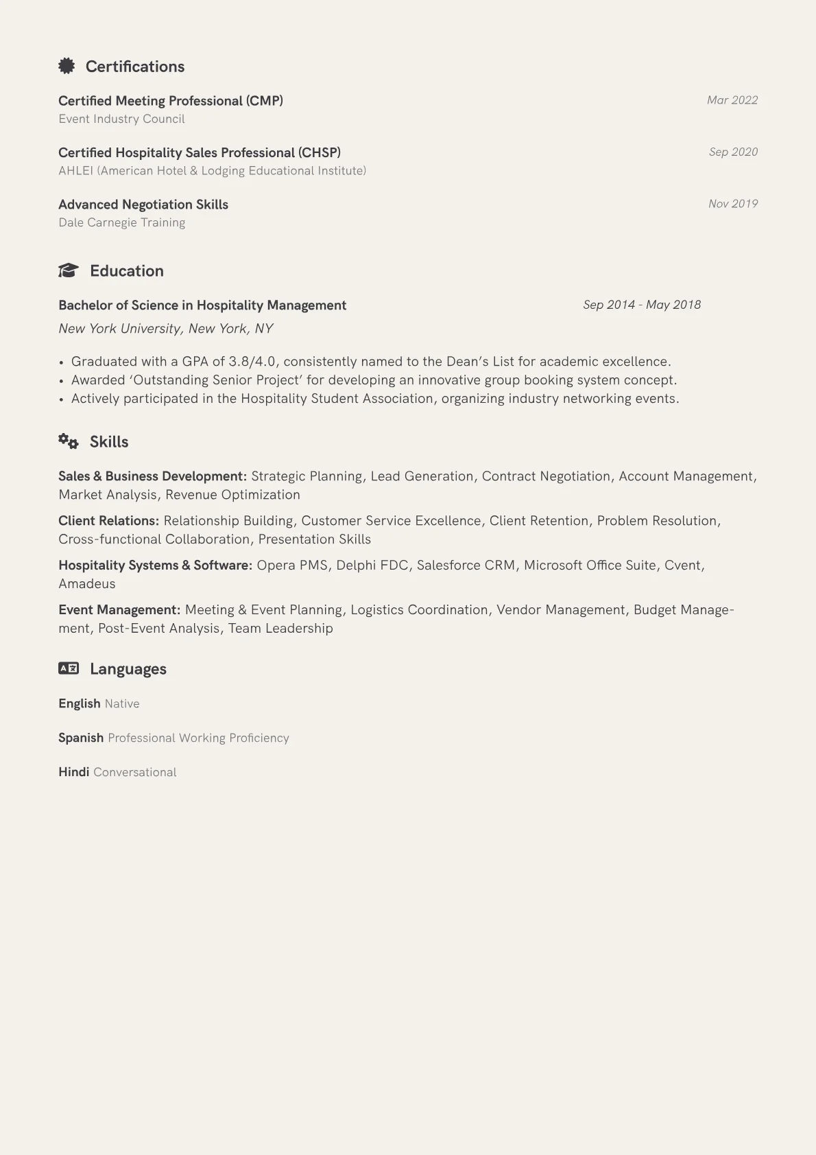 This example resume effectively showcases these critical elements. It thoughtfully groups relevant skills under clear headings, separating core sales competencies from client relationship management and technical proficiencies. Each professional experience entry features meticulously quantified achievements, such as "Exceeded quarterly sales targets by 18%, securing $750k in new group business" or "Increased repeat client engagement by 15% through tailored solutions." Furthermore, the resume prominently lists relevant industry tools and sales certifications, demonstrating practical aptitude for managing intricate group sales processes, which is crucial for an "Other" industry context where specific product knowledge might be less universal.