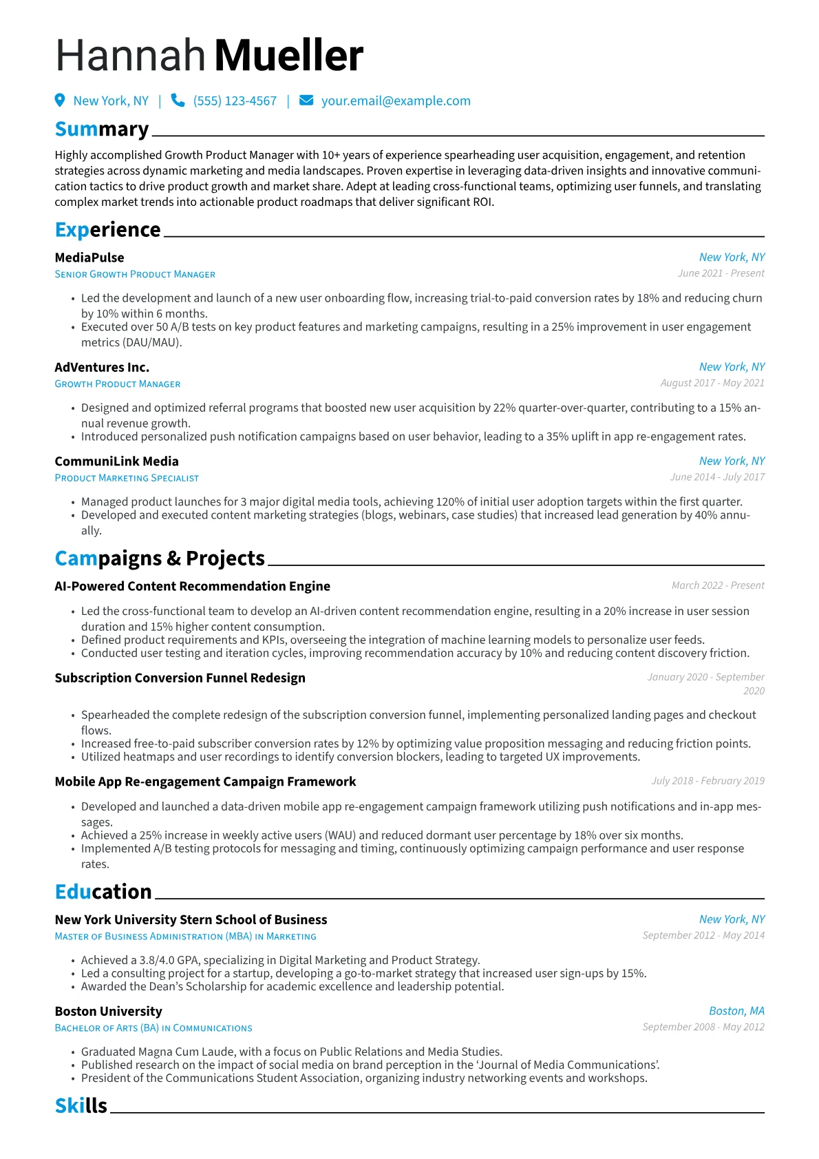 A robust resume for a senior Growth Product Manager in Marketing & Advertising must unequivocally demonstrate tangible impact on the AARRR funnel. Hiring managers prioritize candidates who can showcase measurable achievements in user acquisition, activation, retention, and revenue generation. Concrete examples include optimizing onboarding flows to increase conversion by specific percentages, leading A/B tests that significantly uplift click-through rates, or implementing strategies that reduce churn by X%. Command of tools like Amplitude, Mixpanel, SQL, and various marketing automation platforms, alongside certifications in Google Analytics or HubSpot Growth Stack, signal a candidate's readiness to tackle complex growth challenges.