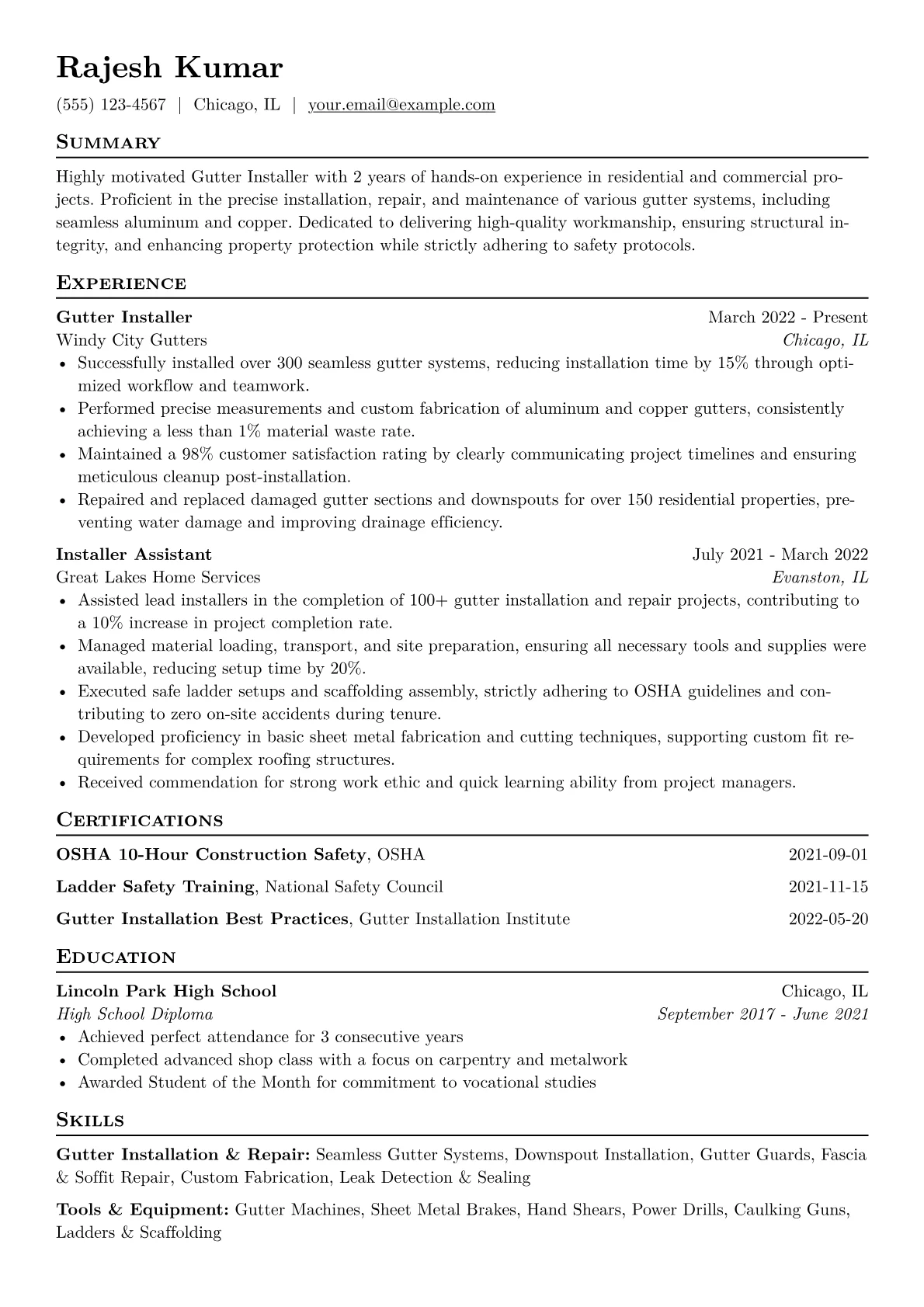 For entry-level Gutter Installer roles in manufacturing, hiring managers seek candidates who demonstrate foundational technical aptitude and a strong commitment to safety. Resumes should highlight experience with specific tools like sheet metal brakes, crimpers, and snips, alongside familiarity with materials such as aluminum, copper, or vinyl. Critical achievements include assisting in efficient project completion, maintaining quality installation standards, and any relevant safety training such as OSHA 10 or ladder safety certifications. Emphasizing precision in measurements and ability to follow installation schematics is crucial.