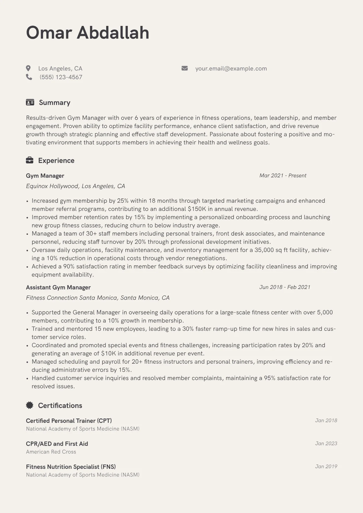 This template was built with JobSprout and offers an excellent foundation. Users can easily customize it to create their own tailored Gym Manager resume.