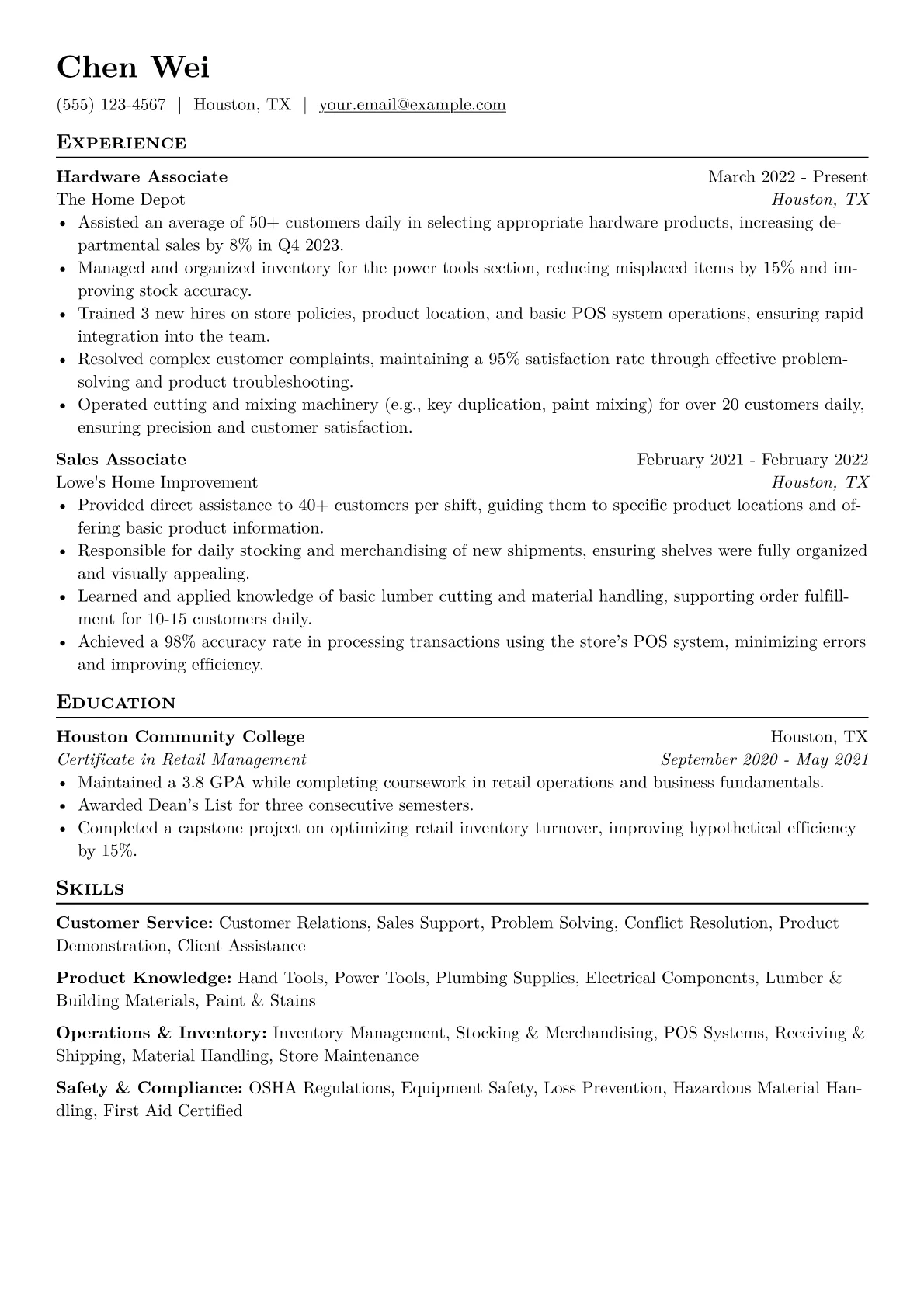 A strong Hardware Store Associate resume for entry-level roles emphasizes practical skills and customer service aptitude. Retail and E-commerce hiring managers seek candidates who can efficiently assist customers with diverse product needs, possess basic tool knowledge, and demonstrate a proactive approach to problem-solving in a fast-paced environment. Navigating extensive inventory and providing tailored advice are key challenges in this sector.