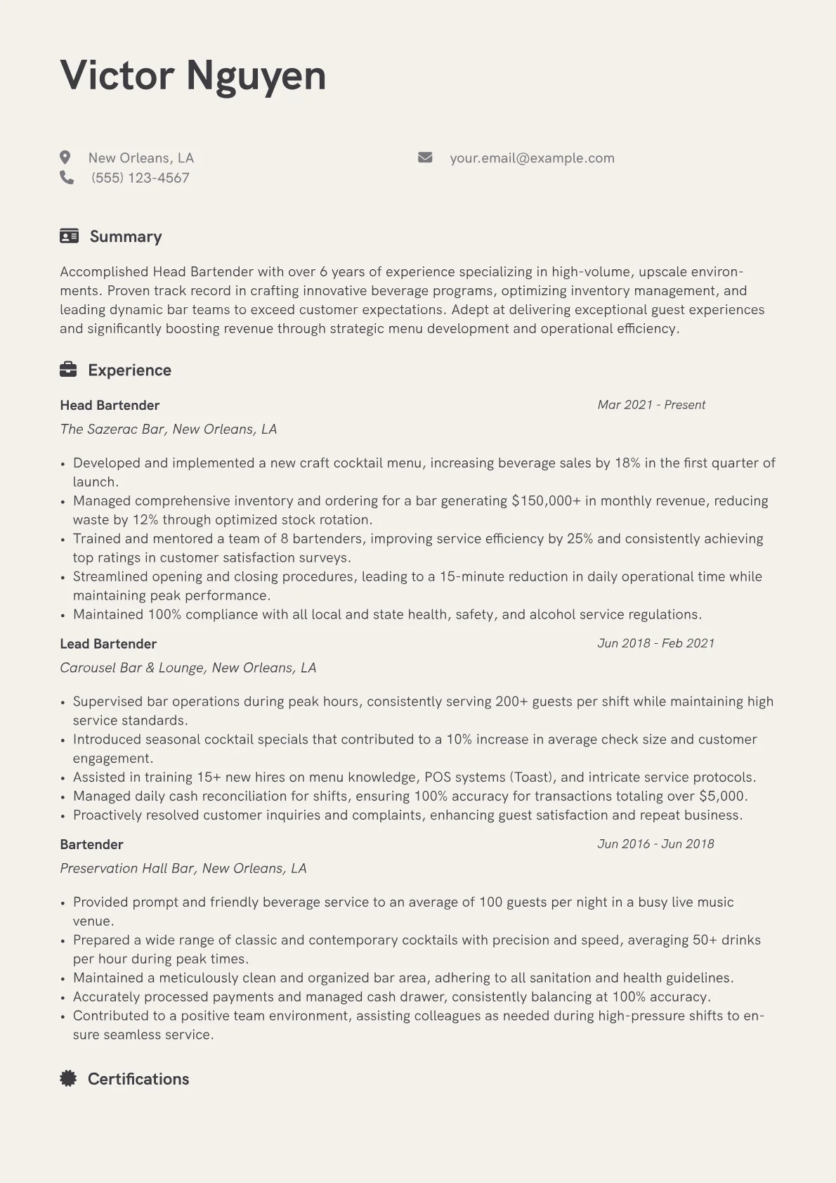 This JobSprout example skillfully highlights these crucial aspects. Achievements are quantified, such as "increased quarterly bar sales by 18% through a revamped cocktail program" or "reduced inventory discrepancies by 15%." Skills are thoughtfully grouped into categories like "Bar Operations & Leadership," encompassing vendor relations, scheduling, and staff development, alongside "Mixology & Service Excellence," detailing signature drink creation and advanced spirit knowledge. Key certifications, including TIPS and ServSafe, are clearly presented, ensuring compliance and professionalism are immediately evident.