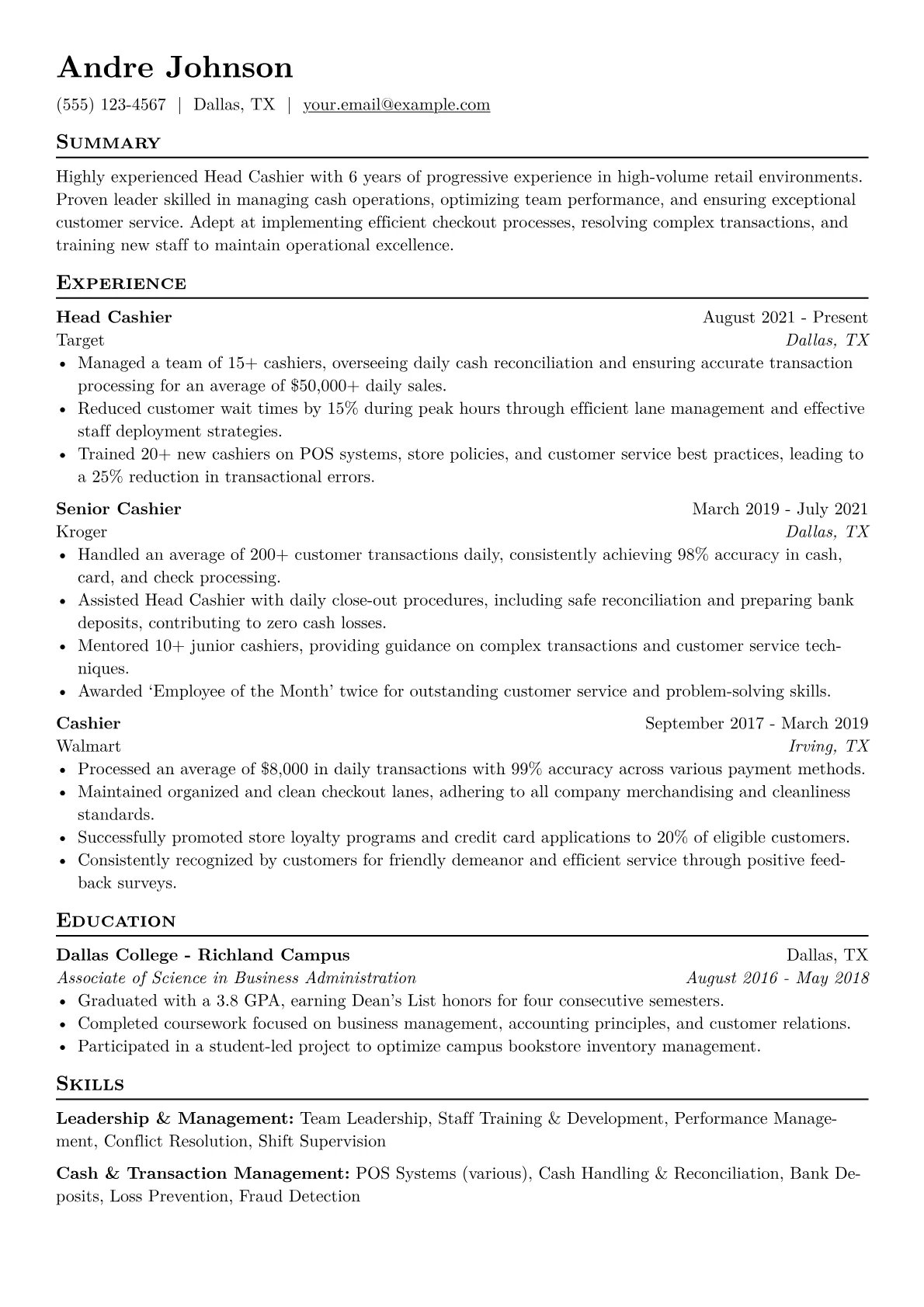 This example CV excels by structuring its content to highlight these critical areas. Achievements are consistently quantified, illustrating concrete contributions rather than just responsibilities; for instance, detailing leadership over a team of 8 cashiers or managing daily transactions exceeding $15,000. Skills are effectively grouped under categories like "Cash Handling & Reconciliation" and "Team Leadership & Development," immediately signaling relevant competencies. Furthermore, specific POS systems and cash management software are explicitly listed, demonstrating practical tool proficiency vital for a Head Cashier.