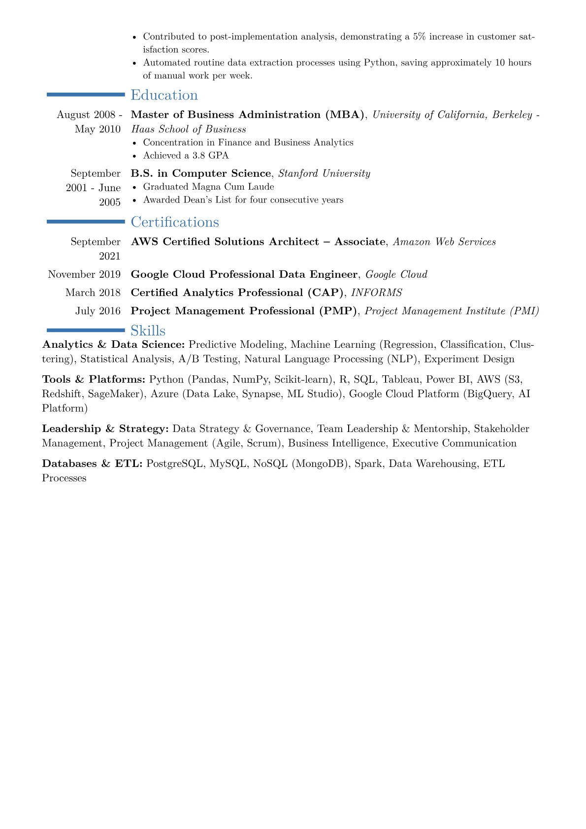 This example CV excels by structuring accomplishments with powerful impact statements, clearly quantifying contributions such as "improved forecasting accuracy by 15% across three major client projects." Technical skills are segmented logically, distinguishing between programming languages (Python, R, SQL), visualization tools (Tableau, Power BI), and big data technologies (Spark, Hadoop). Certifications in relevant platforms or methodologies are prominently featured, immediately conveying specialized expertise crucial for complex consulting engagements. This structure effectively highlights both strategic leadership and the underlying analytical horsepower expected of a Head of Analytics.