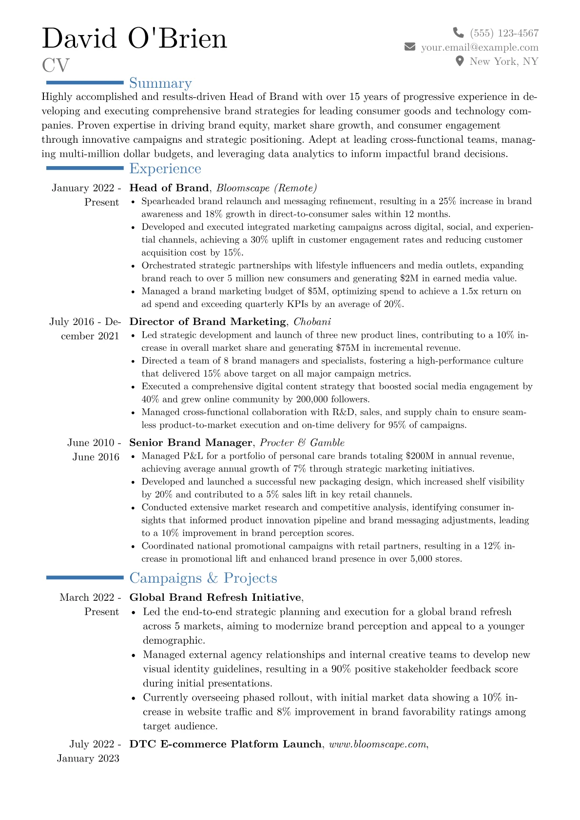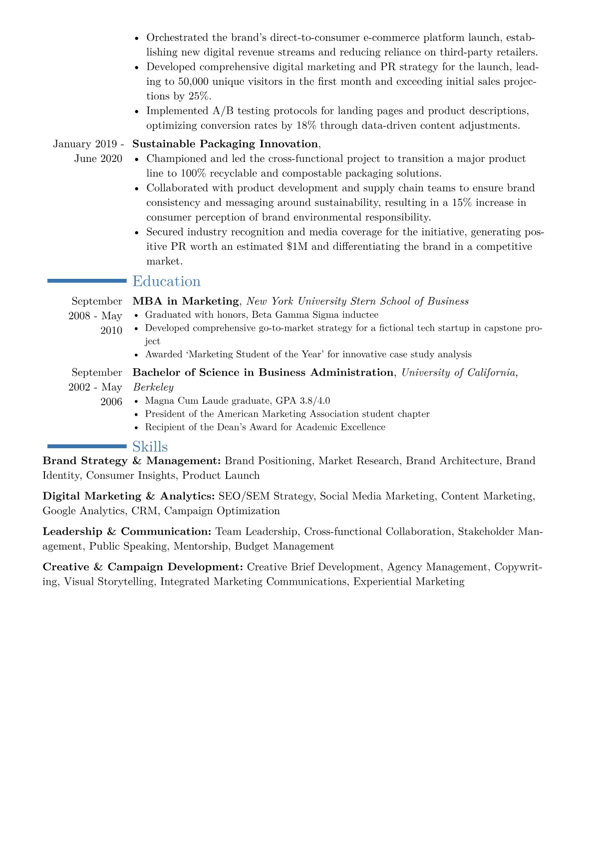 This example CV effectively highlights a Head of Brand's executive-level capabilities. Achievements are robustly quantified, for instance, showcasing increased brand awareness by specific percentages or managing substantial marketing budgets. Skills are strategically grouped into areas such as "Brand Strategy and Development," "Digital Marketing Leadership," and "Cross-functional Team Management," providing immediate insight into the candidate's holistic expertise. Furthermore, relevant certifications like "Google Analytics Certified" and proficiency in key tools such as "Adobe Creative Suite" are prominently featured, reinforcing a blend of strategic oversight and hands-on understanding critical for the role.