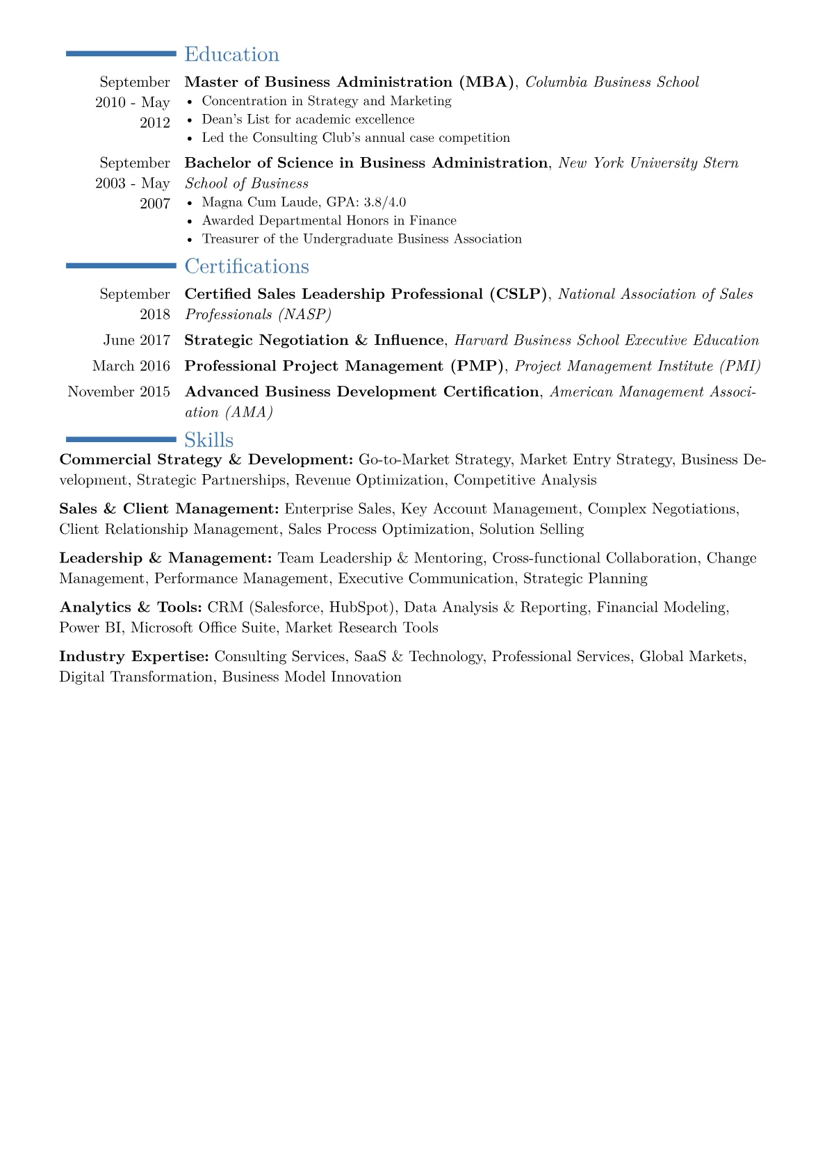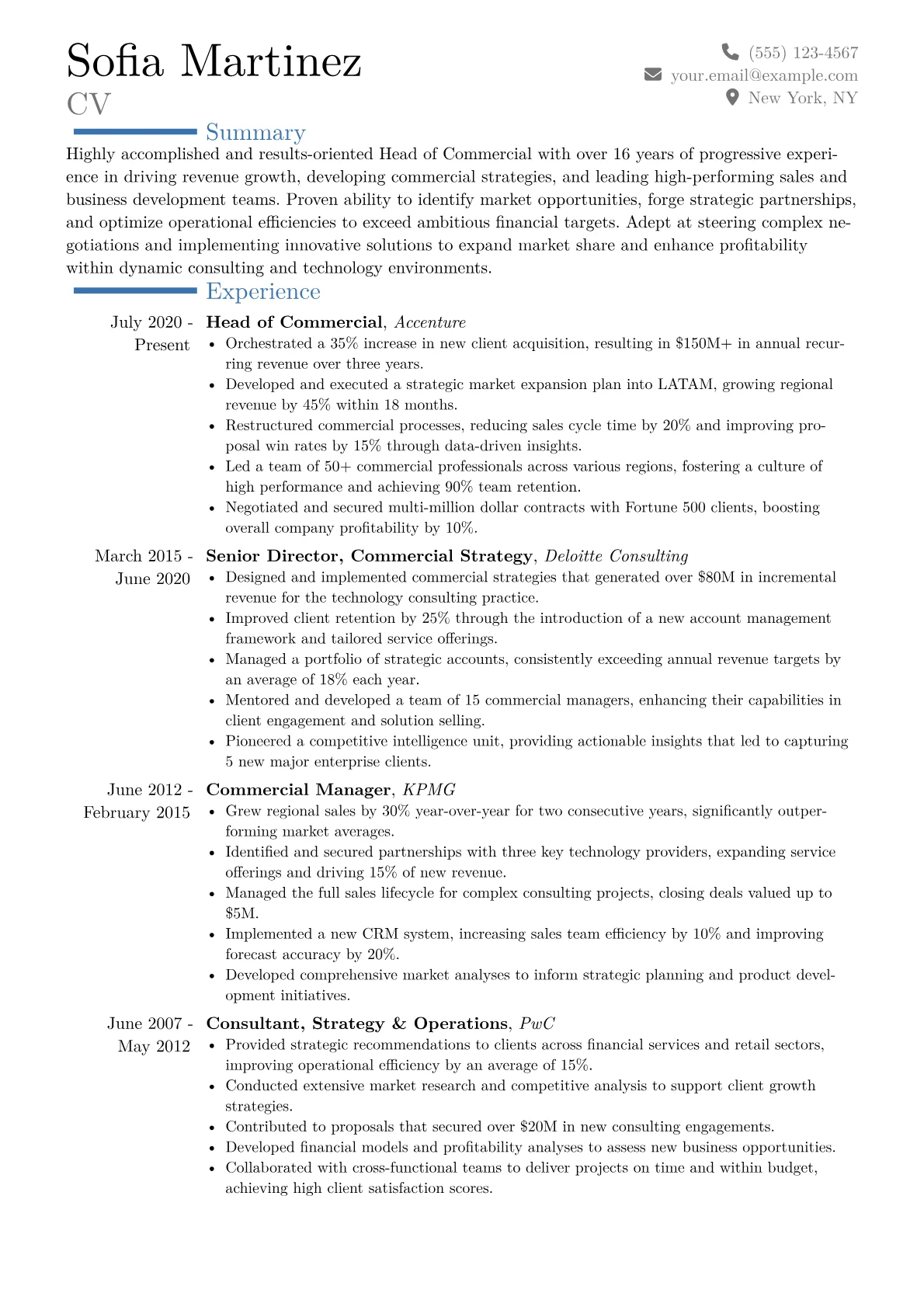 This example CV effectively highlights the necessary executive acumen. Its structure immediately draws attention to quantified commercial achievements, such as "secured $20M in new strategic engagements" or "expanded client portfolio by 40% over three years." Skills are judiciously grouped under headings like "Commercial Strategy & P&L Management," "Global Client Acquisition," and "Consulting Practice Development," demonstrating a holistic understanding of the role. Crucially, the resume integrates industry-specific tools and methodologies, noting proficiency in advanced CRM platforms for pipeline management and expertise in complex contract negotiation frameworks, vital for a Head of Commercial in the operations consulting space.