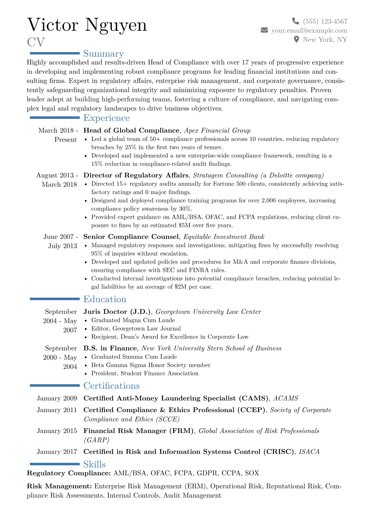 This example CV effectively demonstrates these executive-level capabilities. It quantifies achievements by detailing reductions in non-compliance incidents by specific percentages or outlining cost savings from proactive risk mitigation. Skills are strategically grouped under headings such as "Regulatory Strategy & Governance," "Operational Compliance," and "Risk Mitigation," featuring specific regulations and frameworks. Certifications such as CCEP are prominently displayed, alongside relevant tools like GRC platforms (e.g., Archer) or data analytics software, reinforcing a comprehensive technical and strategic profile tailored for advisory roles.