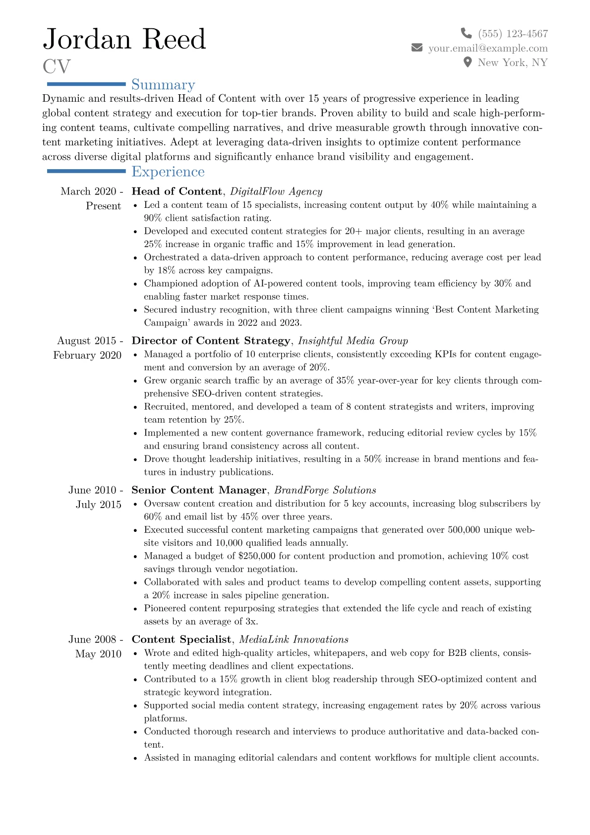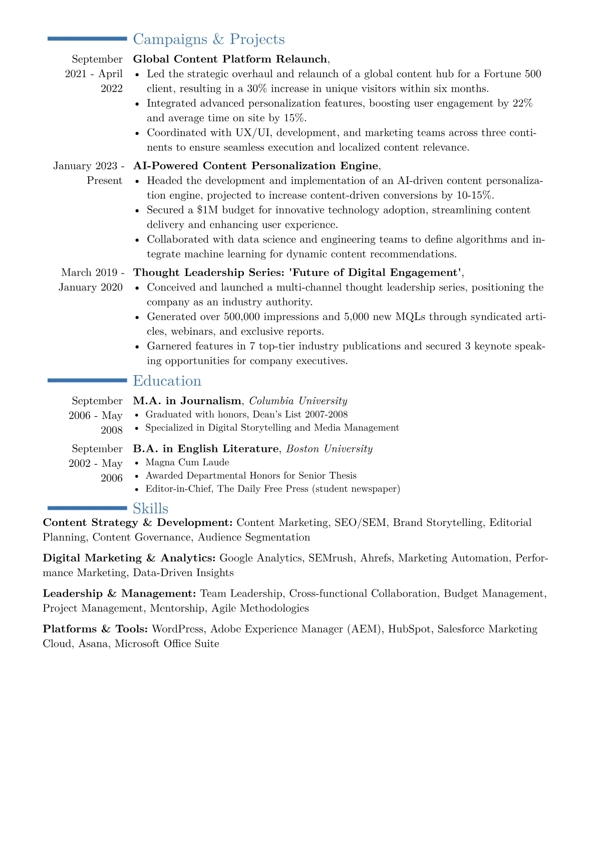 This example CV effectively highlights these critical elements. Achievements are quantified precisely, detailing percentage growth in audience engagement or revenue contributions directly attributable to content initiatives. Key skills are logically grouped under categories such as "Content Strategy & Operations" and "SEO & Performance Marketing," emphasizing strategic leadership over tactical execution. Specific content tools like SEMrush, Google Analytics, and various CMS platforms are integrated within experience bullet points, demonstrating operational fluency in parallel with executive oversight.