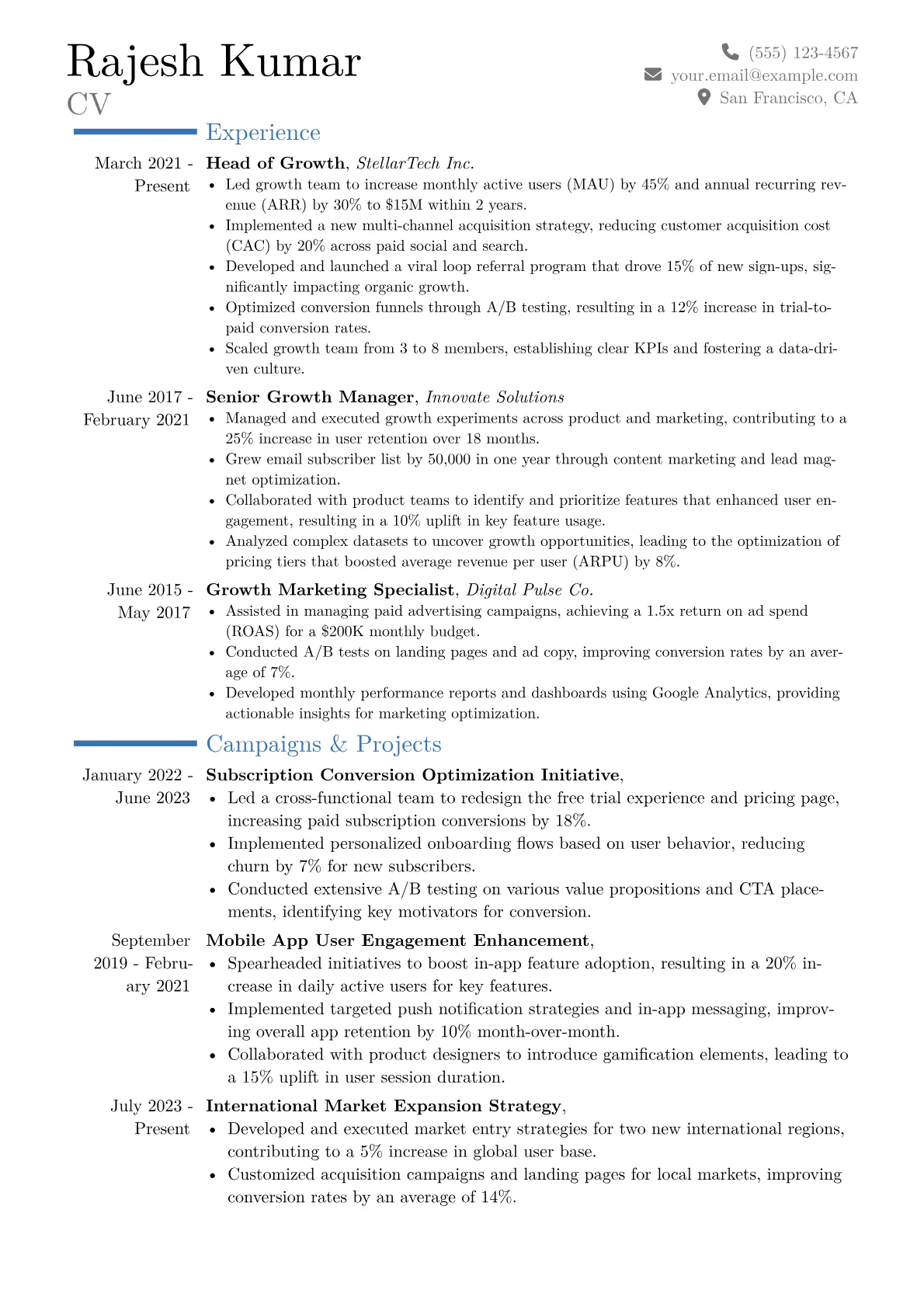 A compelling Head of Growth resume for the technology sector must immediately showcase a track record of driving scalable user acquisition and revenue. Hiring managers seek clear evidence of strategic leadership, a deep understanding of product led growth, and the ability to navigate rapid market changes. It is crucial to highlight how previous initiatives directly impacted key business metrics and fostered sustainable growth within a tech environment.