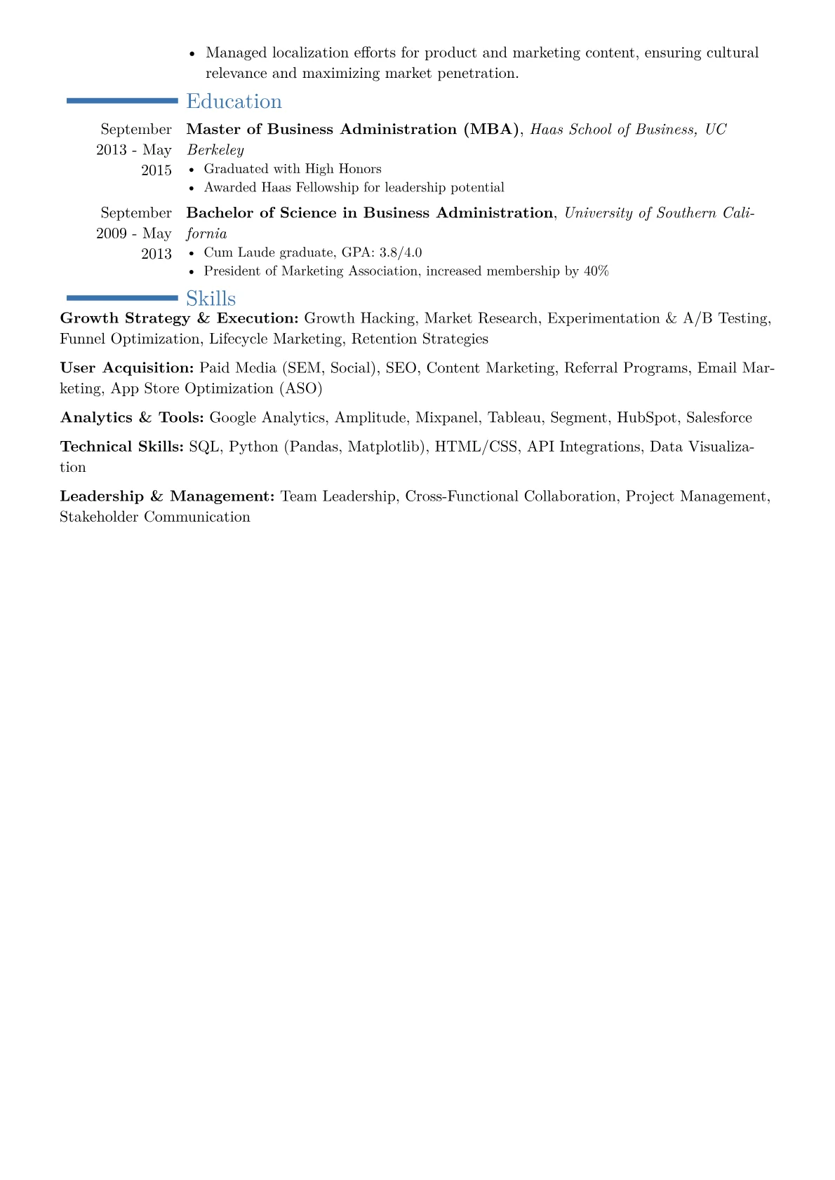 This JobSprout example effectively demonstrates these strengths by emphasizing quantified achievements that detail revenue growth, user base expansion, or conversion rate improvements. The strategic grouping of technical and marketing skills provides a comprehensive overview of the candidate's capabilities, while relevant certifications reinforce their expertise. Each experience bullet vividly illustrates significant contributions and measurable impact.