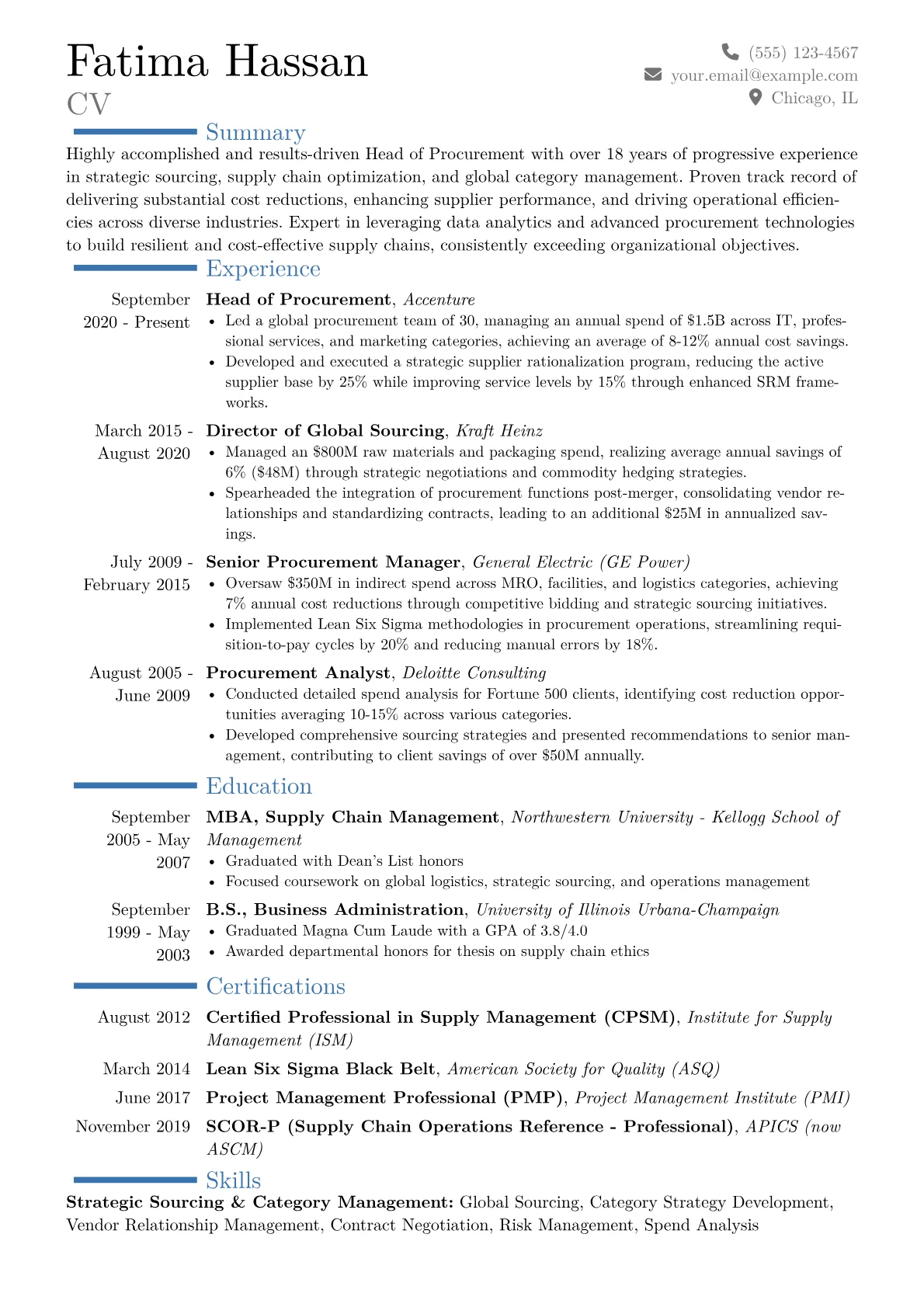 The JobSprout example effectively quantifies achievements, such as "orchestrated 18% annual spend reduction across six client engagements totaling $500M" and "implemented new vendor management systems, improving supplier compliance by 25%." Skills are thoughtfully grouped into sections like "Strategic Sourcing & Category Management," "Digital Procurement & Analytics," and "Global Vendor Relations." Crucially, it highlights relevant operational tools and certifications such as Oracle Cloud Procurement, Coupa, and Lean Six Sigma Black Belt, demonstrating both executive-level strategy and hands-on implementation capabilities specific to this demanding role.