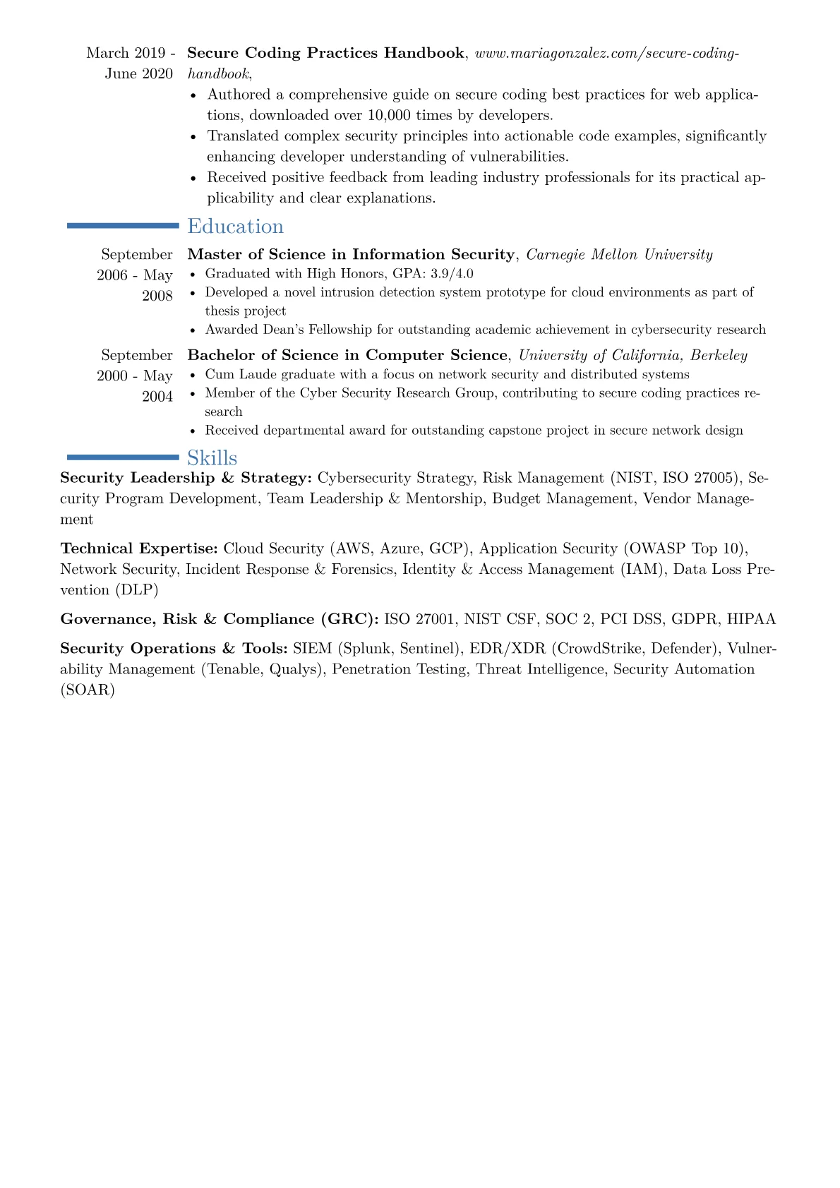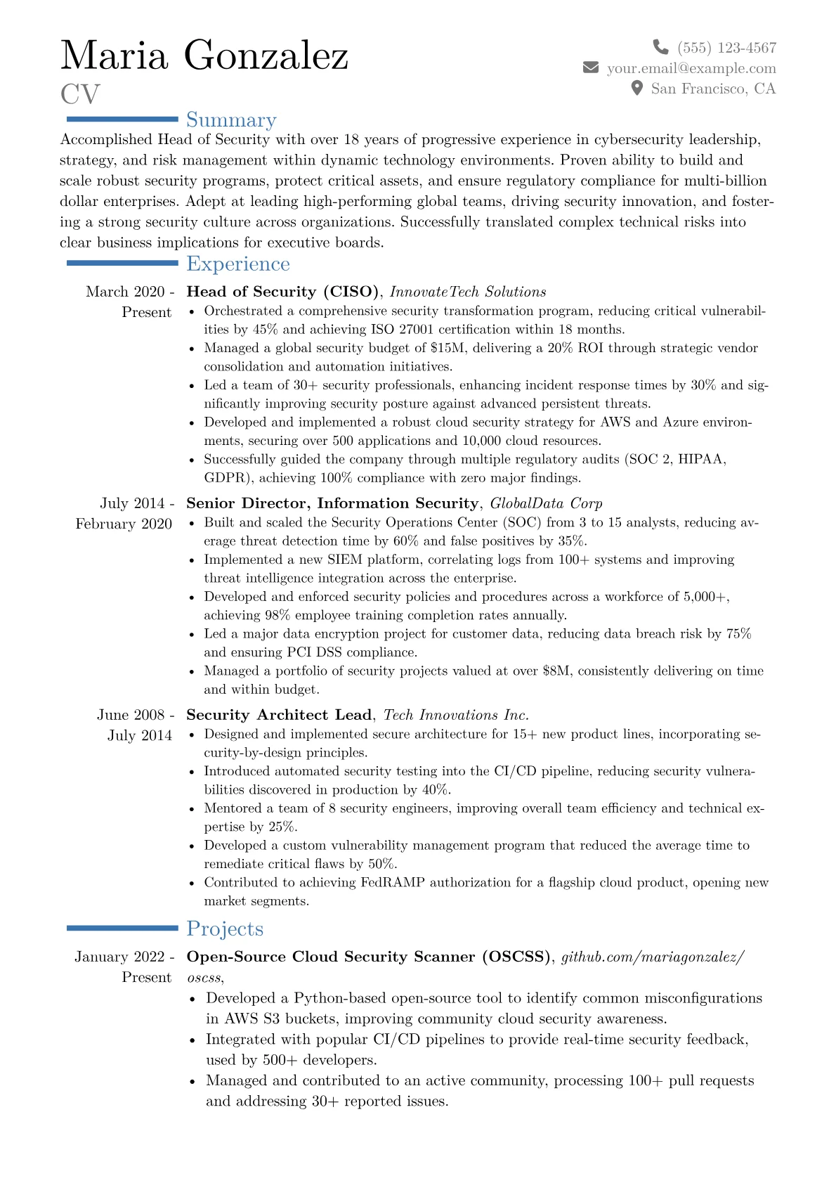 This example CV effectively highlights a Head of Security's critical contributions by quantifying achievements such as "reduced data breach incidents by 25% through proactive threat modeling." Technical and leadership skills are well-grouped into distinct categories like "Cloud Security & DevSecOps" and "Governance & Compliance," clearly showcasing breadth and depth. Crucial industry certifications like CISSP and CISM are prominently displayed, alongside specific security tools and platforms, providing immediate insight into the candidate's operational proficiencies.