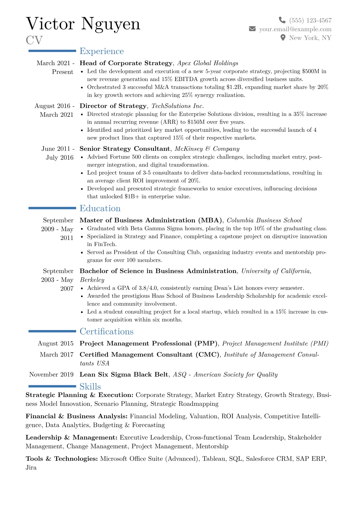 This example effectively highlights those critical elements. It brilliantly uses quantified achievements, detailing measurable outcomes and financial impact from strategic initiatives. The clear skills grouping, separating "Strategic Planning" from "Client Management" and "Leadership Development," provides an easily scannable overview of core competencies crucial for an executive strategy role.