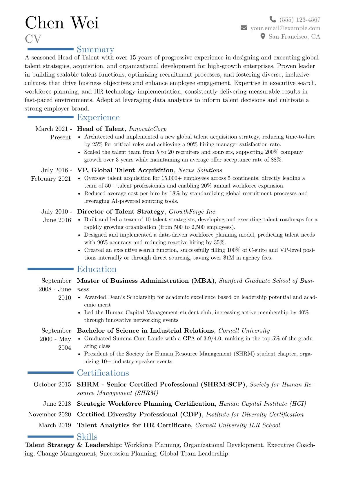 This example CV excels by concretely quantifying these high-level achievements. For instance, it highlights reductions in time-to-hire for executive roles or measurable increases in leadership retention, demonstrating direct business impact. Skills are logically grouped under headings such as “Talent Strategy & Acquisition,” “Organizational Development,” and “HR Technology & Analytics,” providing a clear overview of a comprehensive skillset. Crucially, relevant certifications and proficiency in enterprise HRIS or ATS platforms are clearly sectioned, assuring recruiters of both strategic vision and operational capability.