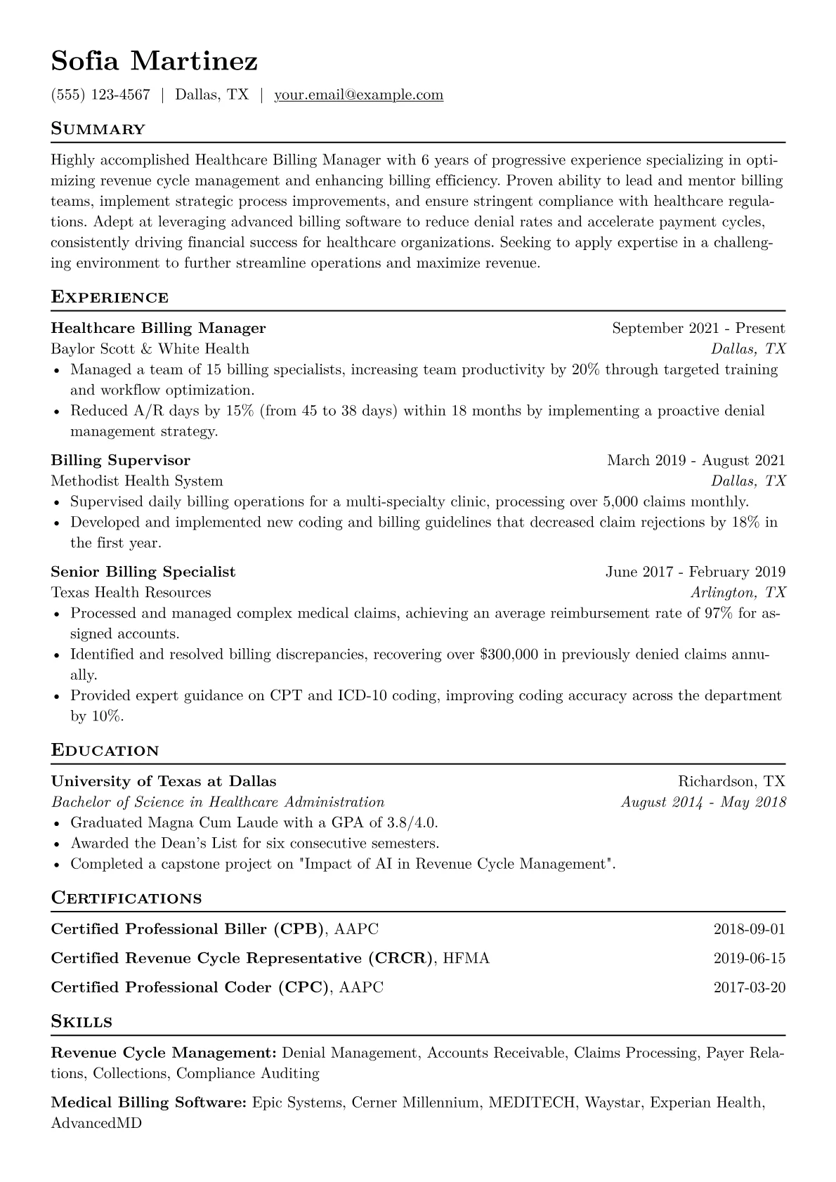 This example resume effectively showcases these critical elements. Achievements are precisely quantified, detailing improvements in collection rates and billing accuracy, rather than relying on vague descriptions. Skills are logically grouped, distinguishing between technical proficiencies like specific EHR/EMR systems (e.g., Epic, Cerner) and regulatory expertise. Pertinent certifications, vital for this role, are prominently highlighted, assuring hiring managers of the candidate's professional qualifications.